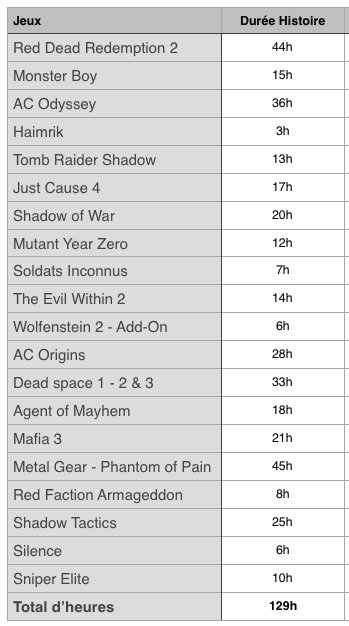 Si comme moi vous voulez vous faire une liste et savoir combien d’heures de jeu vous devez prévoir n’hésitez pas à aller sur le site : “How long to beat” qui vous résume les temps de jeu pour la majorité des jeux actuels. Attention tout de même car ce ne sont que des estimations. Par exemple, j’ai mis 6 heures pour finir Celeste contre 8 heures annoncées. Tout comme j’en suis déjà à plus d’une centaine d’heures à Red Dead Redemption 2 alors que j’essaye tant bien que mal de me focaliser sur la trame principale (fichus pnj sur le bord des routes !).