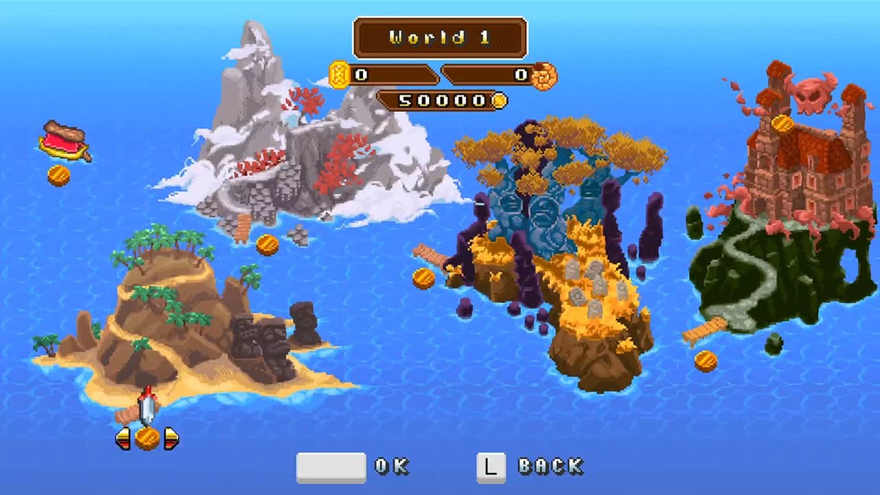 Dès les première minutes de jeu, les références et inspirations de chez Sega et Nintendo sautent aux yeux. Crossover entre Wonderboy et Super Mario Bros, l’histoire de ces pirates s’annonce haute en couleurs. Après avoir choisi un des quatre personnages disponibles, une première phase de jeu propose un initiation sur le pont d’un navire afin de maitriser les coups les plus basiques (saut, glissade, frappe, coup spécial…). Ensuite, place aux combats. À vous d’incarner un des avatars disponibles : Gutz, Spina, Drago ou Elder, et de vous lancer dans l’aventure, seul ou en binôme en mode coopératif. Le succès de cette entreprise passera par la maitrise de 4 mondes, chacun composé de 4 stages (+1 bonus). Le quatrième stage de chaque monde se terminera par l’affrontement contre un boss de fin de niveau.