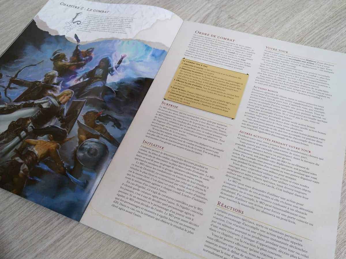 Il faut vraiment que Gale Force Nine lise mes critiques ! (Comment ça, je suis mégalo ?!) En 2018, proposer du contenu lisible sans justifier son texte, c’est juste pas possible. On ne justifie pas un texte pour faire joli mais parce que cela donne de la structure au texte et en facilite la lecture. Mais comme pour le Monster Manual et le Guide du Maître, c’est bien le seul défaut que je peux trouver au design. Enfin, ça et la taille de la police qui aurait bien mérité deux points supplémentaires. Hormis ces détails, le kit D&D5 est à l’image du reste de la gamme. Du beau papier glacé, de magnifiques illustrations (peu nombreuses, cela dit), des tableaux riches en informations et une répartition des informations efficace. Inutile donc de s’attarder sur ce point.