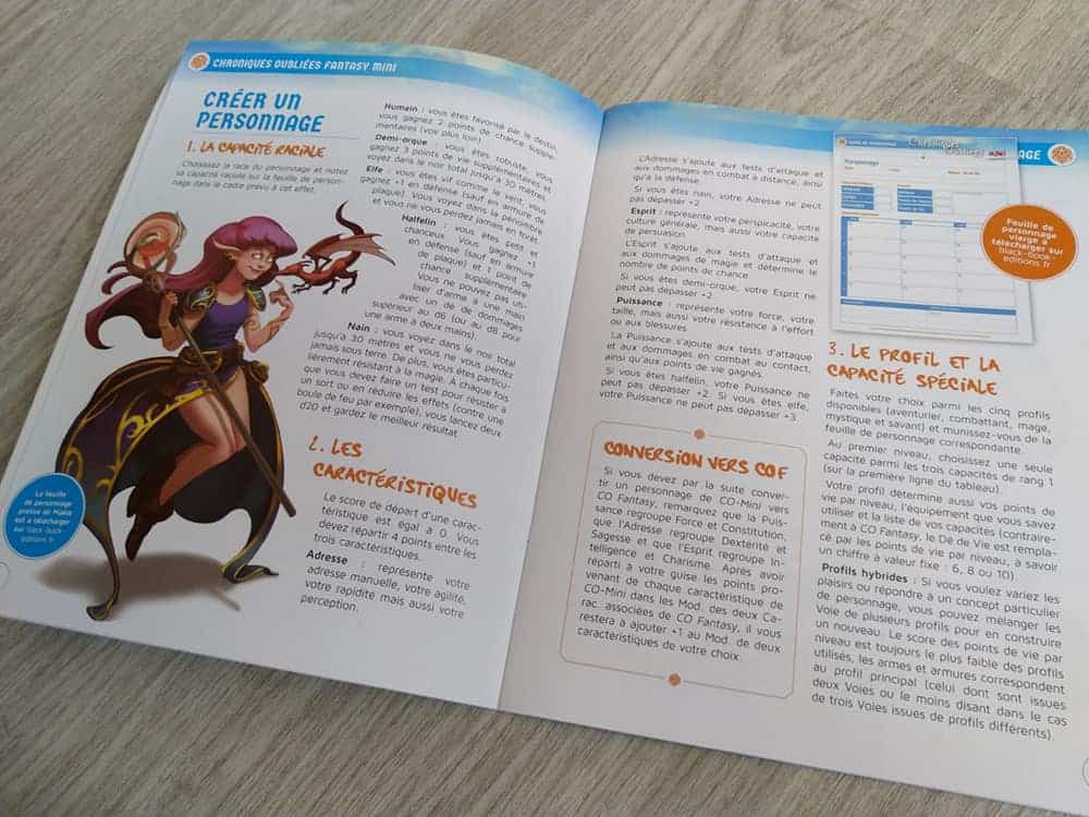 - Le jeu (4 pages) définit les règles simplifiées du système de Chroniques Oubliées Fantasy ;