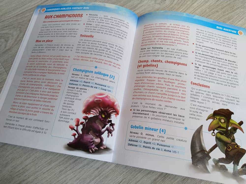 Comme je l’indiquais plus haut, on nage en pleine fantaisie infantile. Bien écrit, lisible et savamment structuré, Chroniques Oubliées Mini se paie des illustrations qui renvoient, dès la couverture, à un univers féerique destiné à un public très jeune. C’est trompeur, certes, mais ça n’en reste pas moins joli. On peut en tout cas saluer l’éditeur de ne pas avoir succombé à la fainéantise marketing et de proposer un véritable design propre à ce jeu. Un travail principalement visible dans le mini-bestiaire du jeu, monstrueusement adorable. Je suis en revanche moins convaincu pas le jeu de couleur bleu/orange du texte (drôle de mélange) mais c’est une préférence purement subjective. Quant au scénario, il est absolument quelconque et trop court.