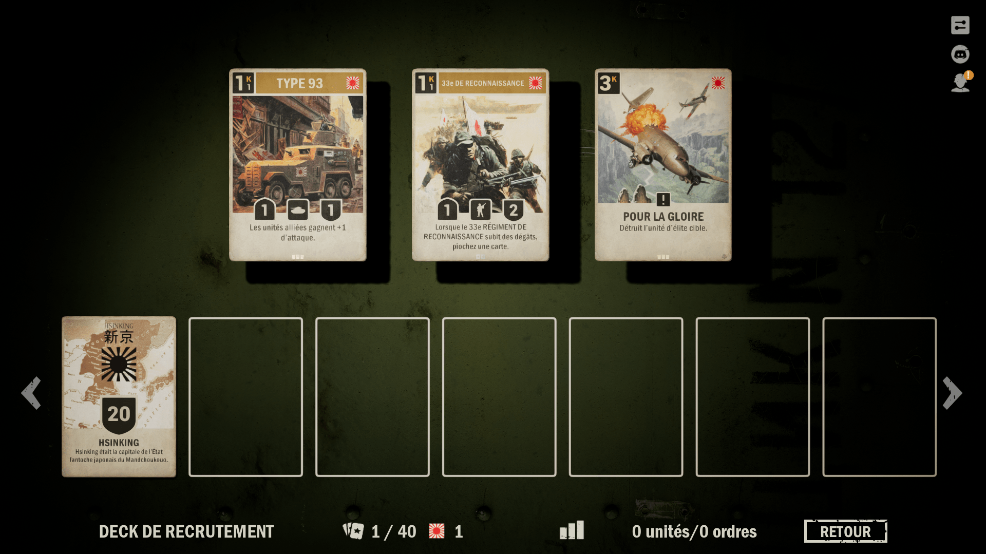 Pour créer votre deck, sachez que 28 des cartes, au minimum, devront provenir d’une faction majeure (Grande-Bretagne, Allemagne, URSS, Japon, USA). Les 12 cartes restantes proviendront de la même nation ou d’une nation alliée.