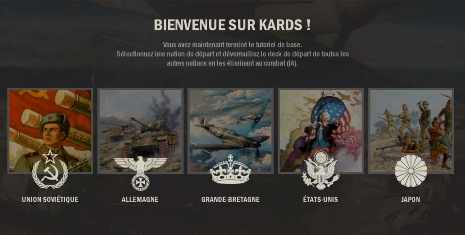 KARDS se voulant être un jeu réaliste, les grands participants du conflit 39-45 sont tous présents : La Grande-Bretagne, l’Allemagne, L’URSS, le Japon ou encore les États-Unis.