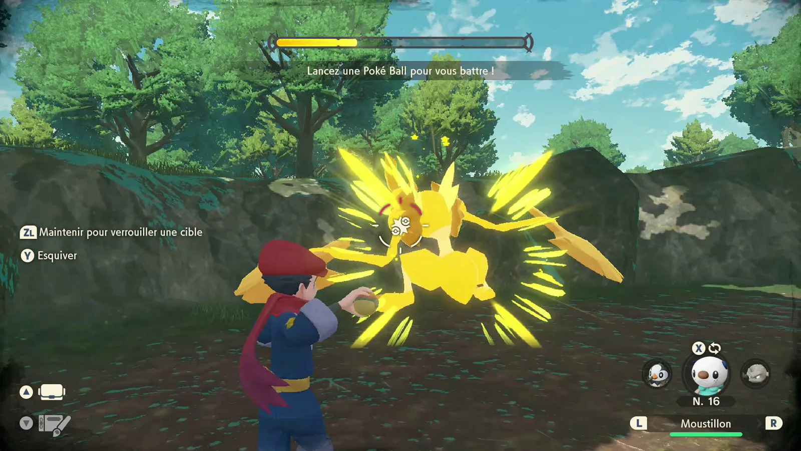 Lorsque l’on se retrouve face à un pokémon, deux options s’offrent à nous : viser et lui lancer une pokéball pour l’attraper ou lancer un de ses pokémons pour initier un combat. De ce côté-là, il n’y a pas vraiment de grandes nouveautés puisque le tout se déroule toujours au tour par tour. On retrouve cependant deux nouveaux styles de combat : le Rapide qui permet d’enchaîner deux attaques faibles et le Puissant qui permet de lancer un coup critique, mais qui confère deux tours à l’ennemi si on ne l’achève pas. En ce qui concerne le bestiaire, on pourra aussi affronter des Barons qui font office de mini-boss et des Monarques qui font office de boss et qui débloquent des zones une fois abattus. Malheureusement, Légendes Pokémon Arceus est extrêmement facile, mais ça a quand même le mérite d’apporter un peu de diversité aux combats.