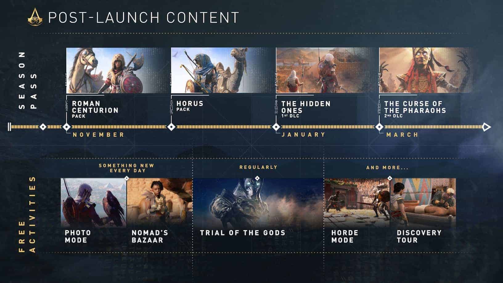 - Les Packs Centurion Romain et Horus : Deux packs de contenus additionnels incluant de nouvelles tenues, armes, boucliers et montures. Disponibles en novembre 2017.