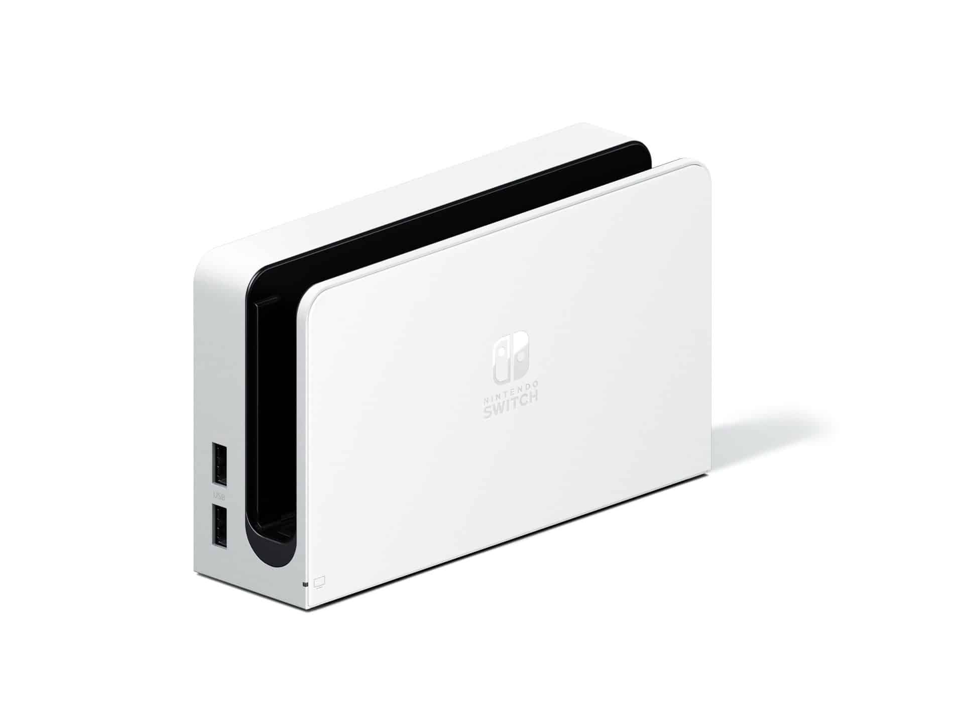 - Nintendo Switch (modèle OLED) avec station d’accueil et manettes Joy-Con blanches, qui inclut des manettes Joy-Con blanches, une unité principale noire et une station d’accueil blanche.
