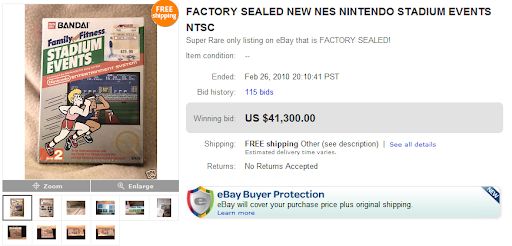 En sortant le jeu Stadium Events, l’éditeur ne devait certainement pas se douter qu’une trentaine d’années plus tard, son jeu allait affoler la toile et que le site eBay serait témoin d’une vente absolument record de $41 300 soit environ 36 000€ ! Une somme aussi importante est rare dans le domaine des jeux vidéo, même si le prix de certaines consoles peut parfois s’envoler aux enchères.