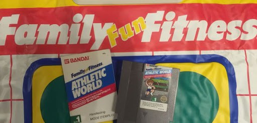 Et c’est le cas de Stadium Events sur Nintendo NES sortie en décembre 1986. C’est un jeu vidéo de sport qui nécessitait un « Family Fun Fitness Pad », espèce de tapis qui permettait de contrôler le joueur à l’écran, ancêtre du Wii Fit ou de Ring Fit Adventure, conçu par Bandai. Ce qui fait sa particularité c’est qu’il n’a été produit qu’à 2000 exemplaires mais très rapidement retiré des ventes car Nintendo racheta les droits du tapis afin de créer le sien et a fait rappeler tous les exemplaires. Cependant, environ 200 copies avaient été vendues et il en reste aujourd’hui une vingtaine en circulation.
