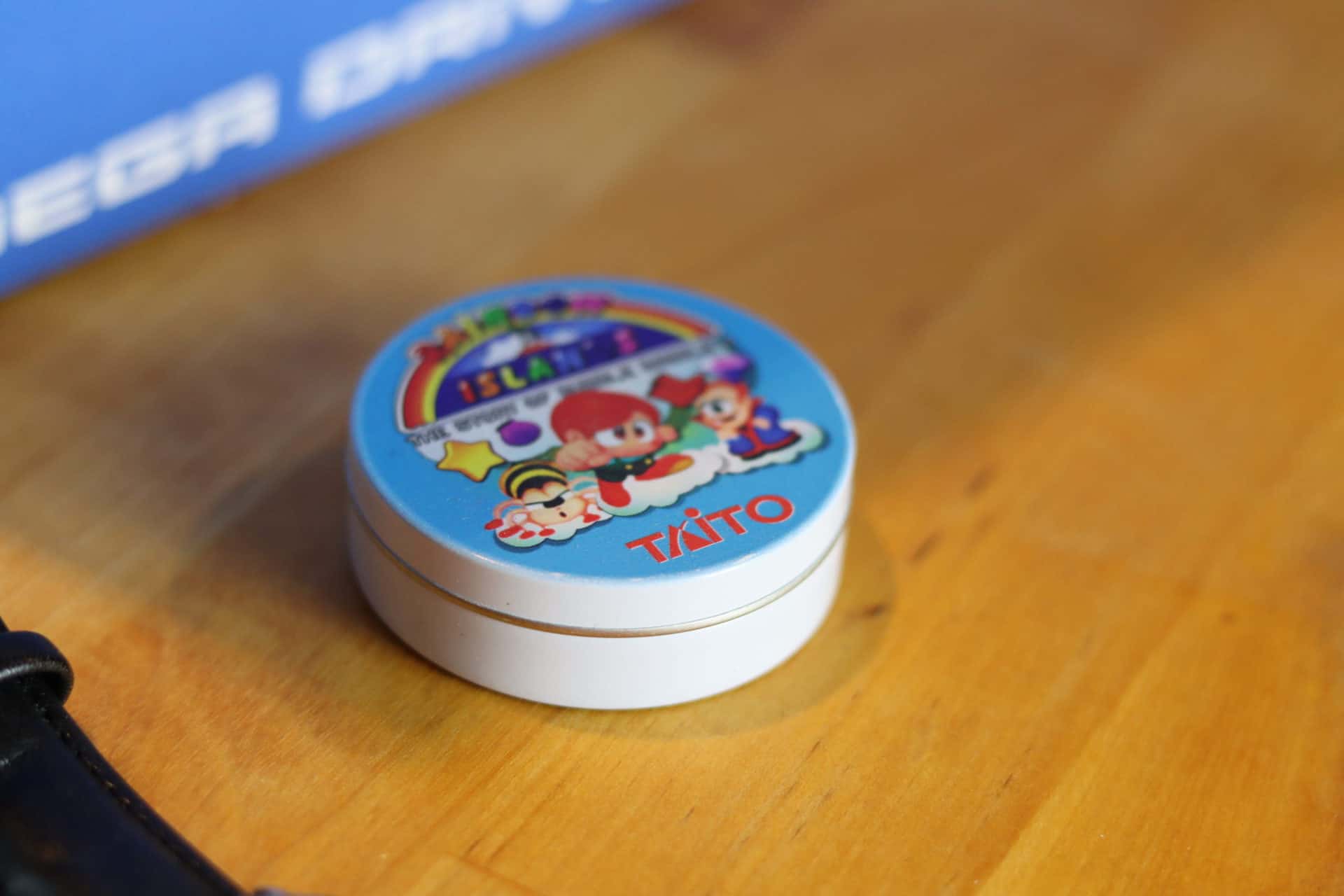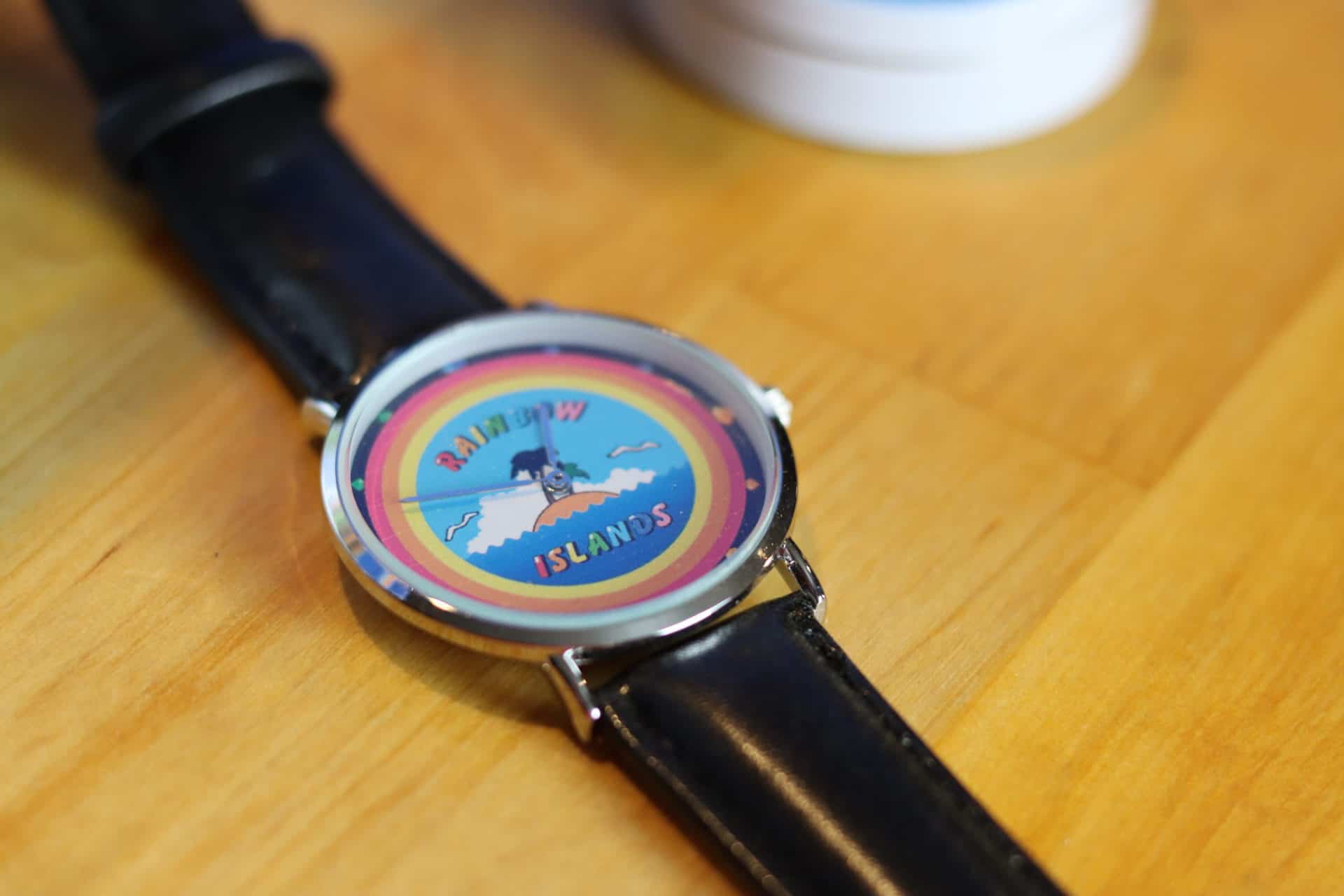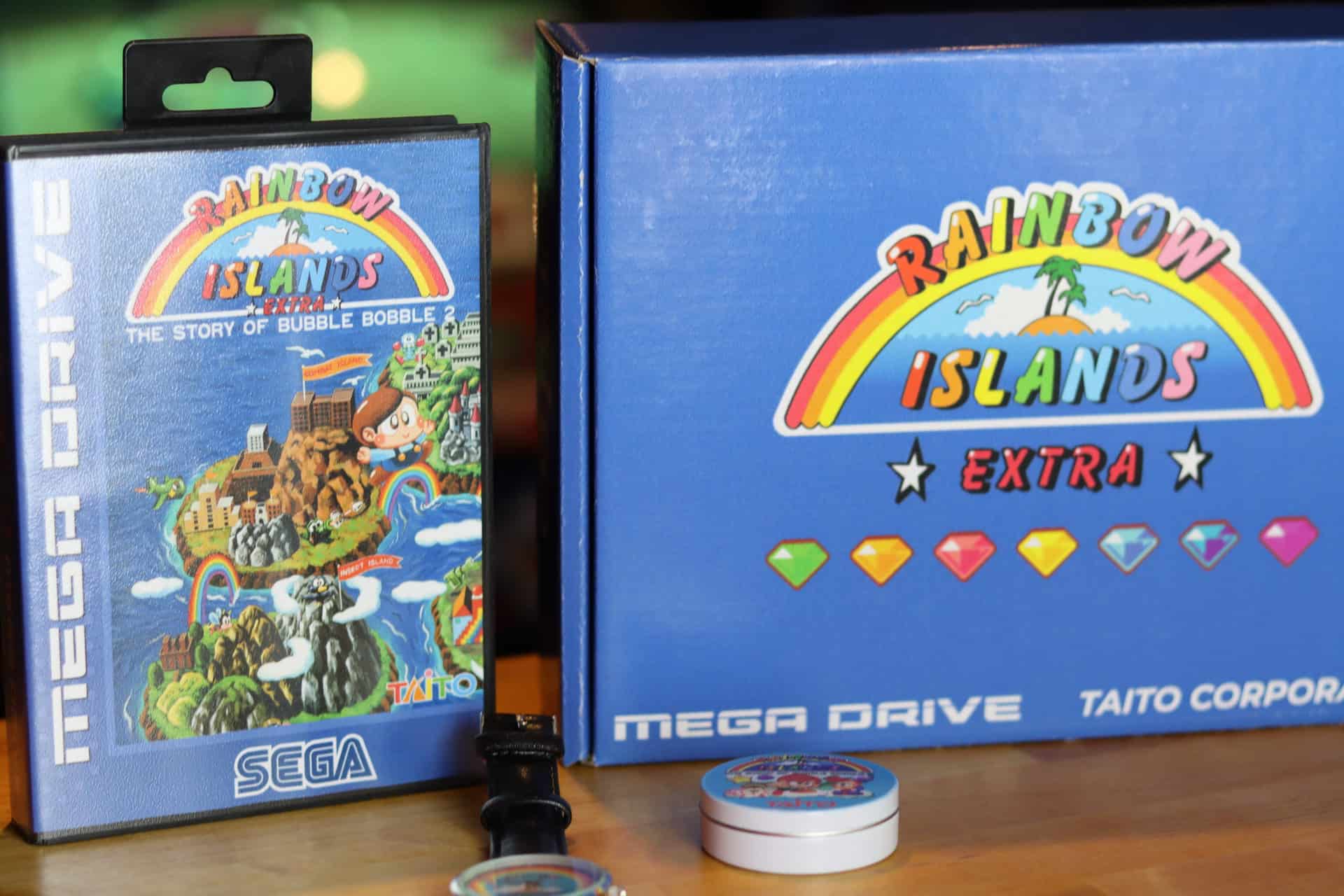 - Lot : 1 exemplaire de Rainbow Islands custom comprenant la cartouche multizone (PAL, US et JAP), la notice, une boite de bonbons et une montre à l’effigie du jeu.