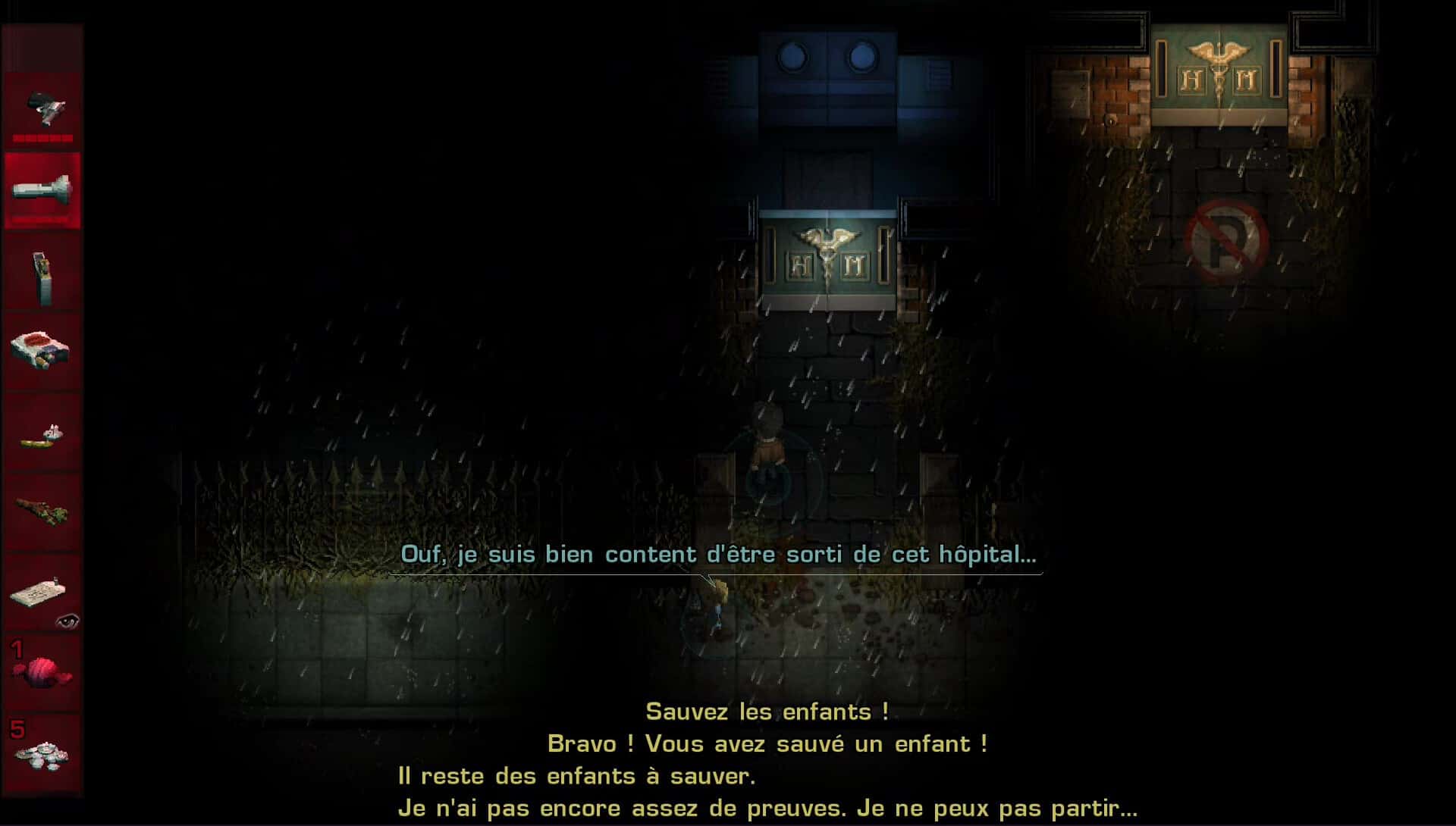 Graphiquement, 2Dark est difficile à juger vu que le jeu a été réalisé en pixel art. Comme je vous le disais plus haut, c’est un choix et pour ma part, cela ne me dérange pas. L’univers glauque est super bien représenté. Par contre, vu le coté hyper sombre du jeu, le manque de « netteté » graphique empêche parfois de voir au-devant de quoi on va avec le personnage. La bande son par contre est extrêmement bien faite et tous les bruits concourent à vous plonger dans cette ambiance polar en permanence. Que dire des pleurs d’enfants impossibles à atteindre qui risquent de vous glacer le sang. Jeunes parents s’abstenir.