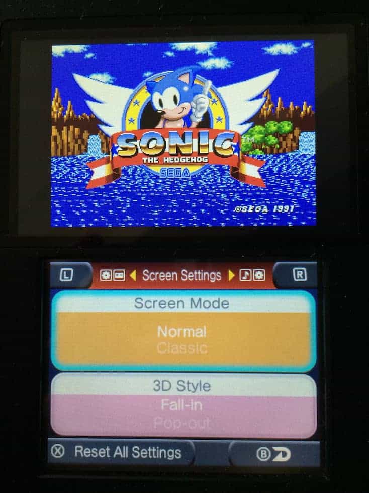 Premier constat lors du démarrage des jeux, ils ne sont pas tous en plein écran ! J’imagine que le ratio d’origine devant être respecté pour certains titres, ils n’ont pas voulu étirer l’image. J’aurais pourtant préféré un Sonic un peu élargi et profiter de tout mon petit lcd. Au niveau du choix des options d’émulation, chaque jeu fera à sa sauce. Sur l’un vous pourrez switcher entre version Japonaise ou Européenne, sur l’autre vous pourrez modifier la difficulté du jeu ou même vous octroyer plus de vie. Sur certains titres c’est vraiment un plus car sans ça votre DS risquerait bien de valser par la fenêtre au bout d’une heure.