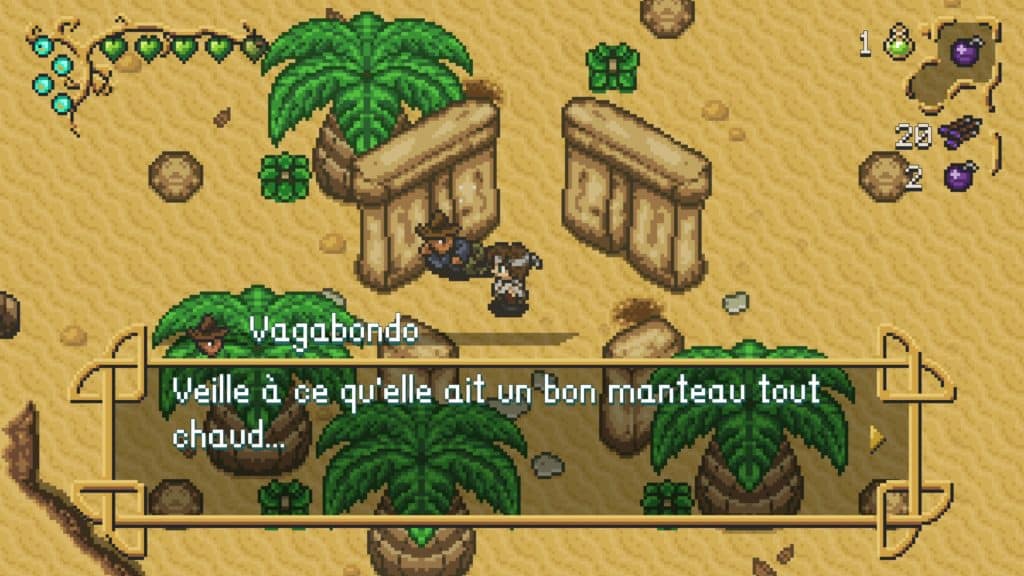 Néanmoins, certains points viennent ternir cette belle vision du combat. Vos déplacements en diagonale sont très imprécis. La hitbox de vos ennemis est souvent très courte. Mais surtout, lorsque vous êtes touché, votre personnage n’a aucun temps de récupération. Malheureusement, dans les situations où vous êtes acculé dans un coin par plusieurs ennemis, cela rend les combats très raides. Ce manque de fluidité se ressent aussi lors des phases d’exploration. Les interactions se font au pixel près, et pour un millimètre, vous pouvez passer à côté d’un passage ou d’une interaction importante.