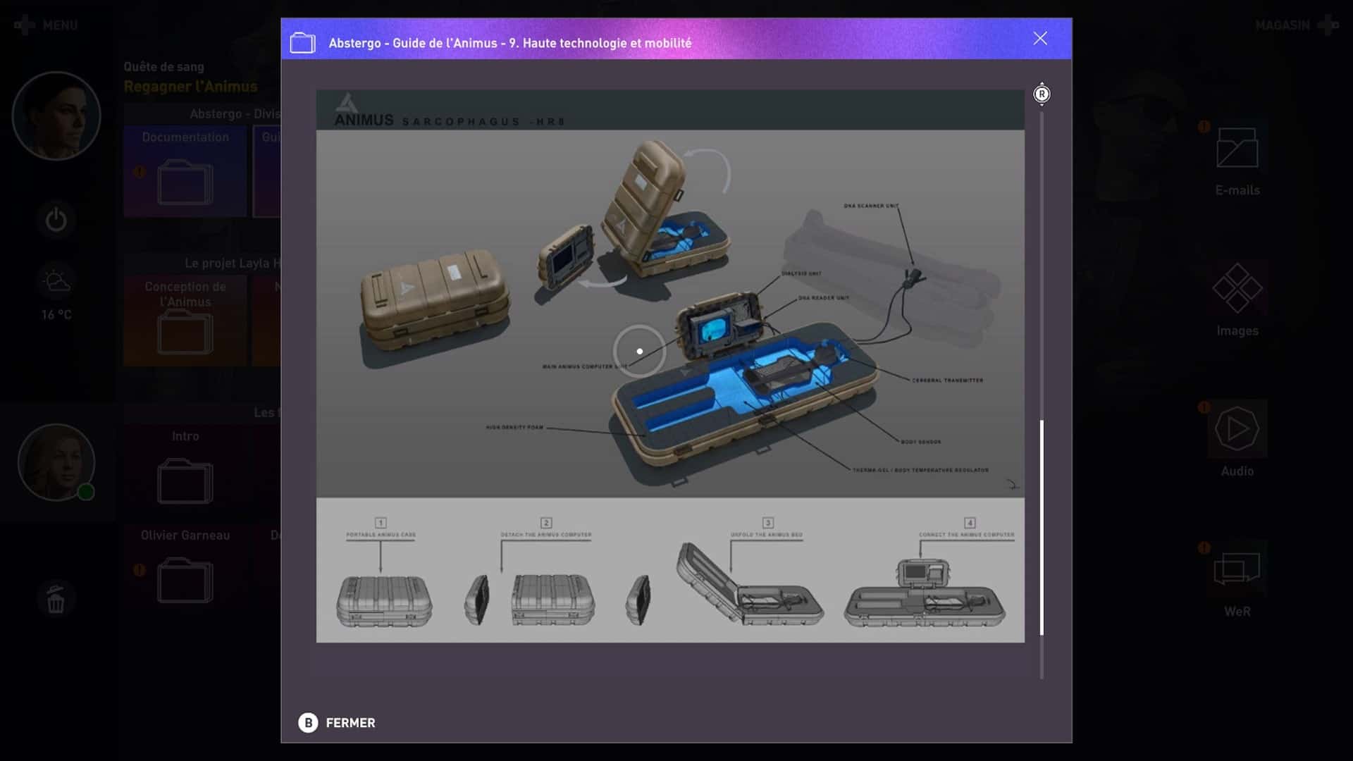 Vous l’aurez compris jusqu’ici Assassin’s Creed fait quasi un sans faute. Mais qu’en est-il de l’histoire que l’on suit depuis notre trop regretté Desmond ? Et bien on s’en fiche un peu ! Ici pas de réel résumé mais bien des dossiers et des mails à foison qu’il vous faudra disséquer si vous voulez comprendre le tout ou simplement vous rafraichir la mémoire. Les passages dans le temps présent se font rares et ne servent finalement qu’à pouvoir accéder à toutes ces informations, mais n’espérez pas trop de ce côté là. L’animus est devenu un gadget portable et vous découvrirez que les moyens d’utilisation ont quelque peu changé. Je ne dis pas pour autant qu’Ubisoft a totalement mis de côté ce pan de l’histoire mais on est loin du 50/50 des débuts d’Assassin’s Creed.