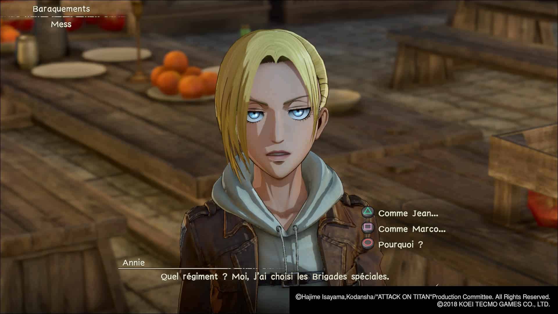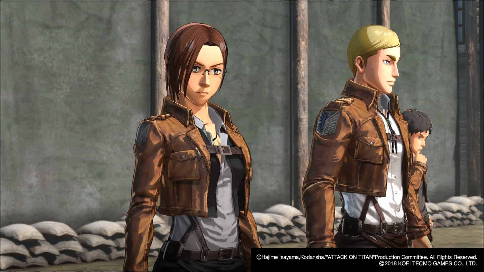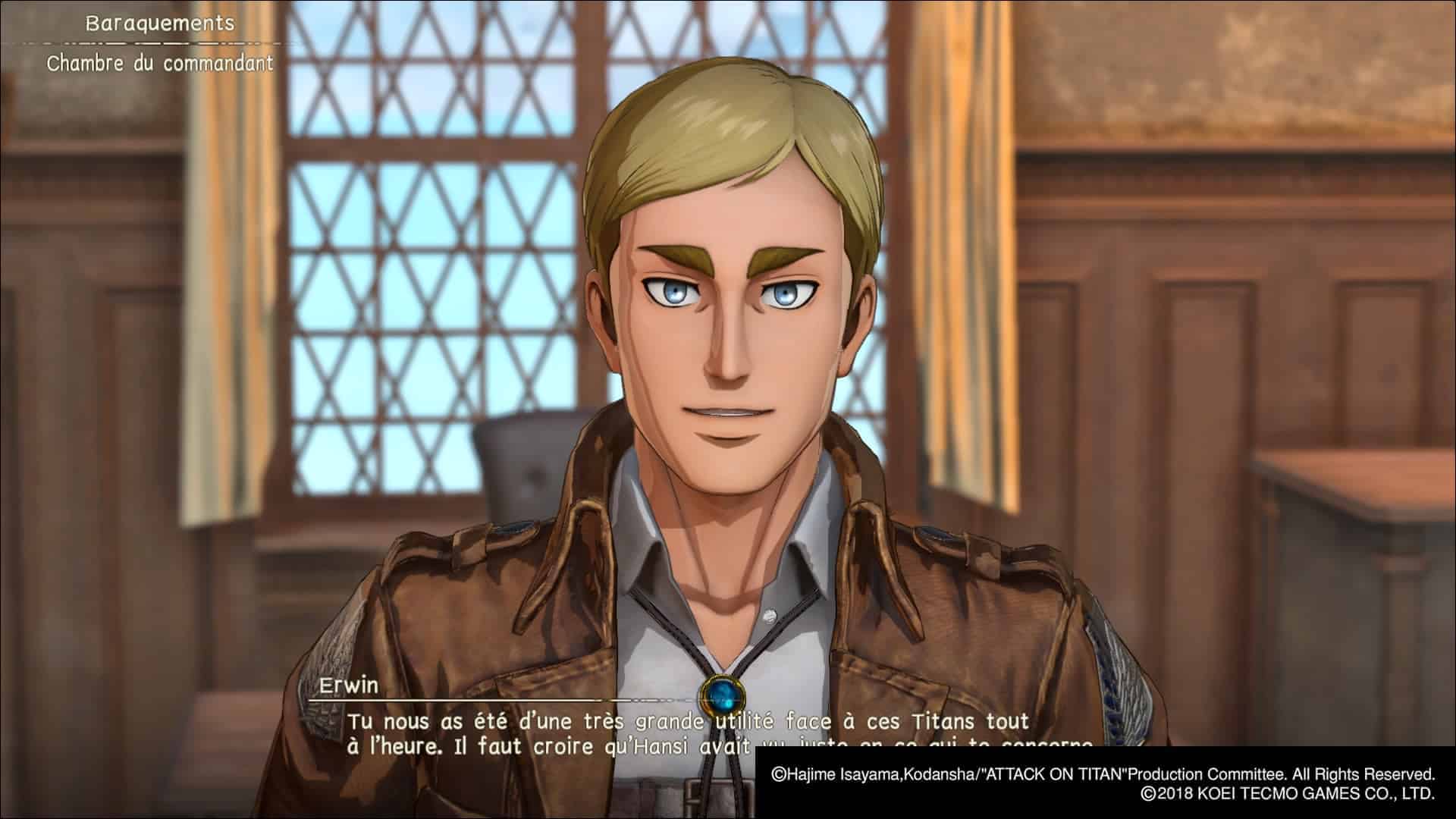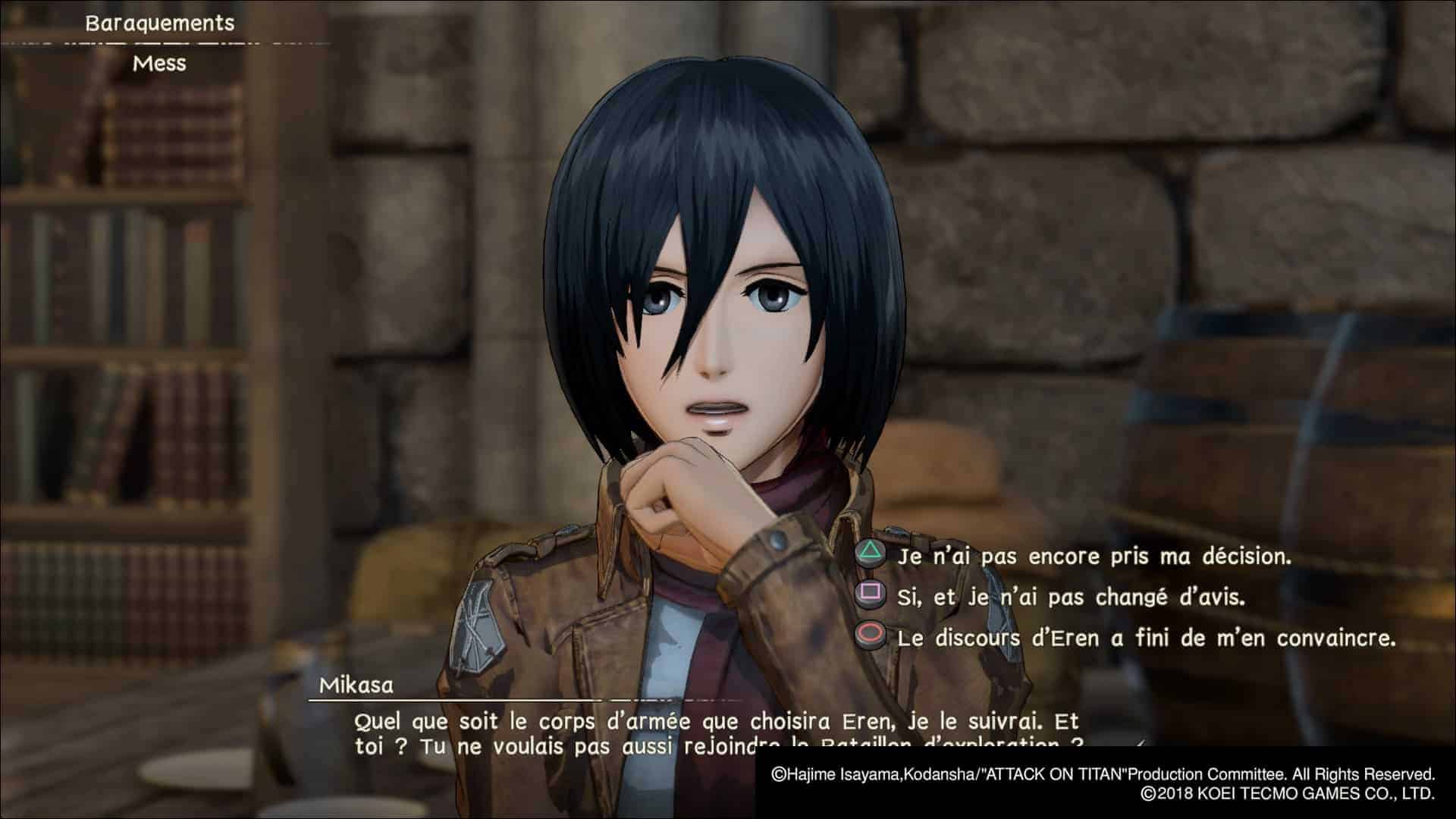 Tout d’abord, exit le jonglage entre les personnages du manga. Dans Attack on Titan 2, on crée son héros ou héroïne qu’on personnalise à l’aide d’un éditeur très complet pour un jeu du genre. On est loin du module de personnages génériques avec 3 coupes de cheveux pour faire genre. Ensuite, on embarque dans l’aventure du début de la saison 1 jusqu’à la fin de la 2 (sans plus, hélas) à coups de cinématiques en vue subjective. Lors des cutscenes par contre, on voit notre personnage qui peut être sollicité pour répondre à diverses questions, interagir avec d’autres personnages avec des choix de dialogues aux conséquences mécaniques (j’y reviendrai). L’idée d’intégrer un personnage s’avère très immersive et permet d’avoir un regard légèrement décalé sur l’histoire.