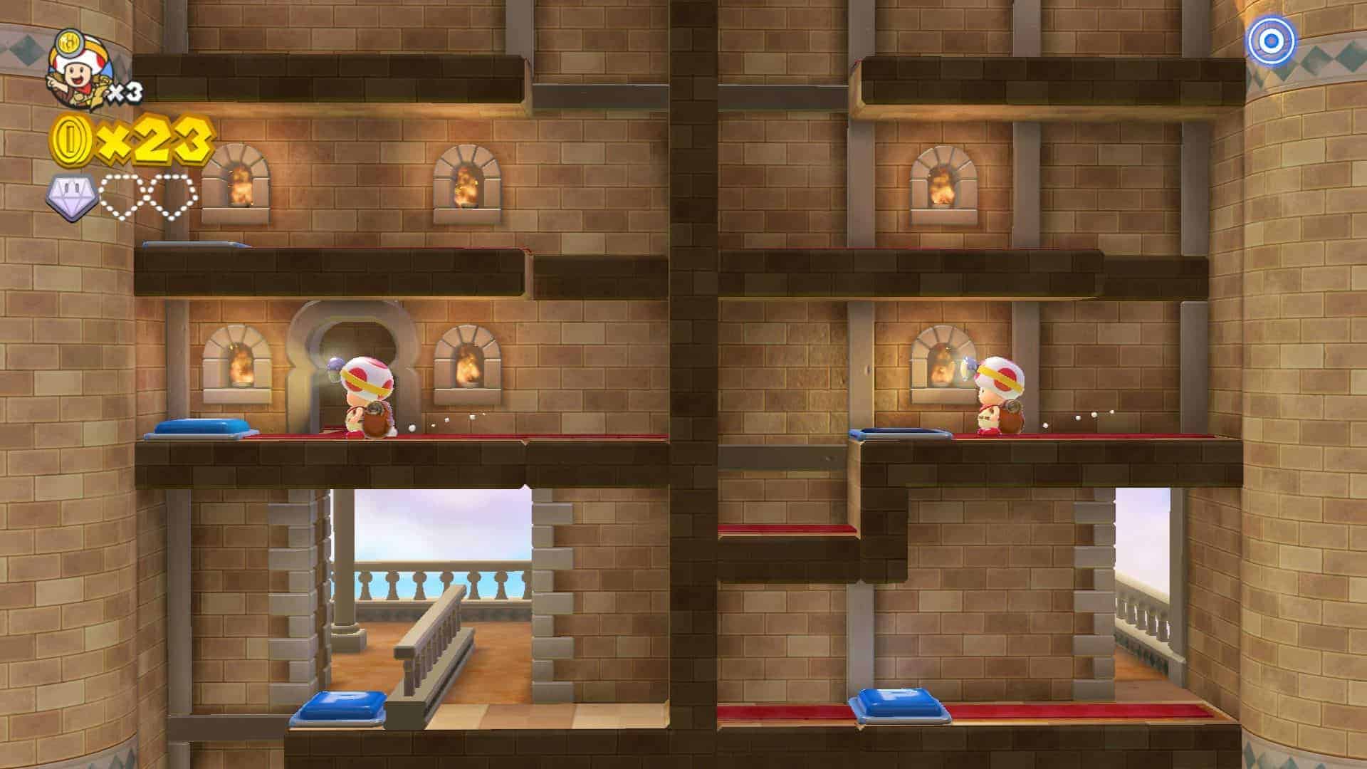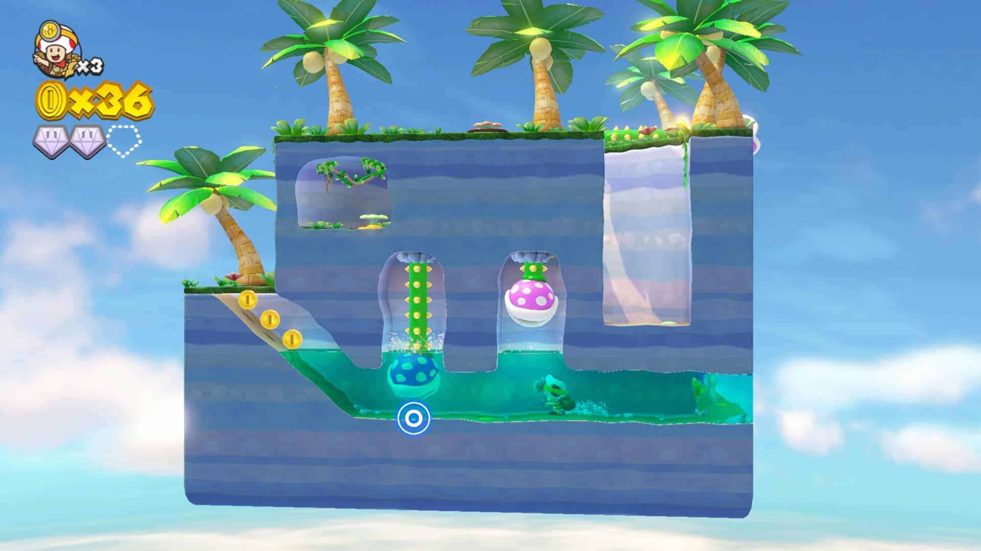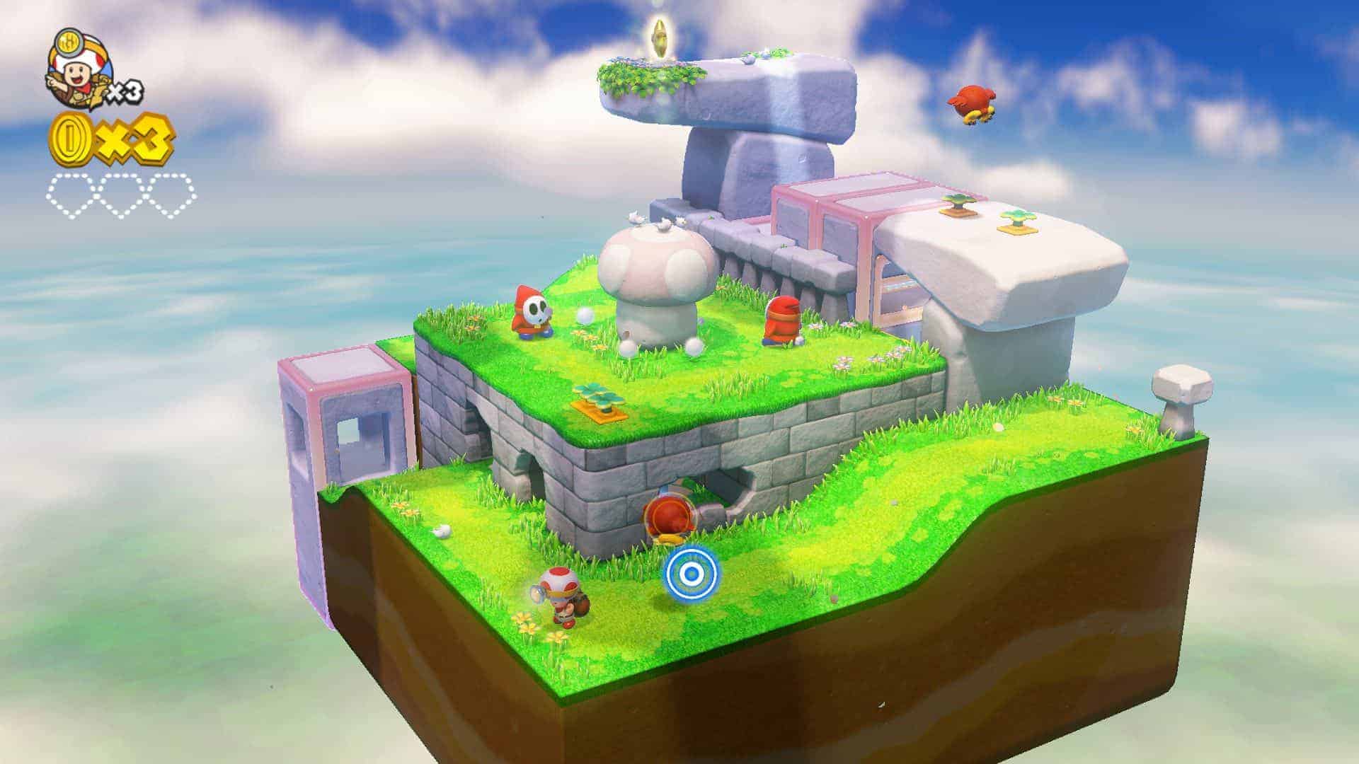 Vous devez commencer à en avoir l’habitude mais il est bien souvent difficile de trouver quelque chose à redire au niveau de la maniabilité des jeux Nintendo. C’est de nouveau le cas dans Captain Toad Treasure Tracker. Hormis quelques petites difficultés parfois à gérer le bon angle de caméra, tout est simple et hyper rapide à prendre en mains. Cependant, on l’excuse quelque peu car le jeu nécessite bien souvent de tourner tout autour afin de découvrir tous les secrets.
