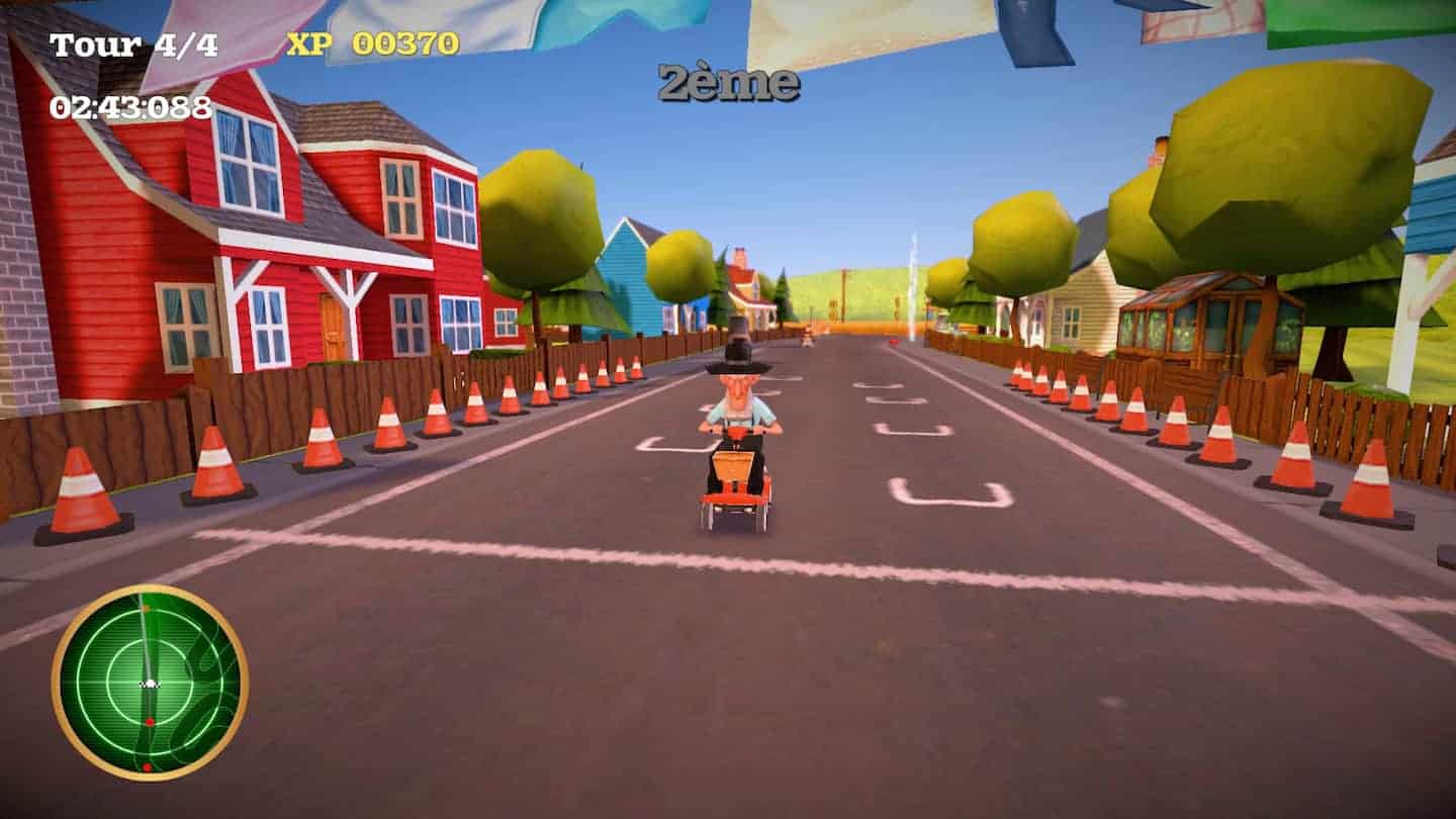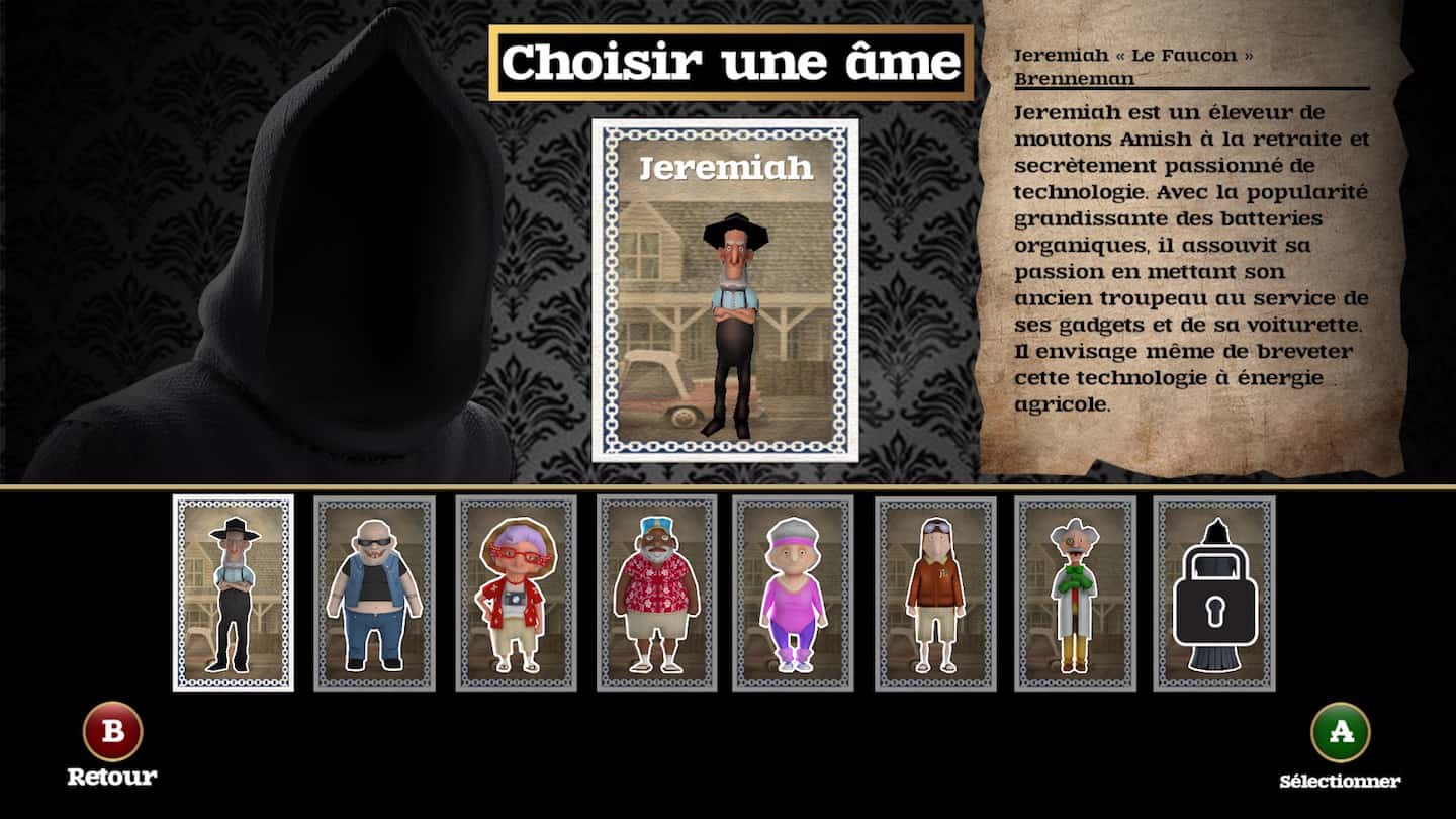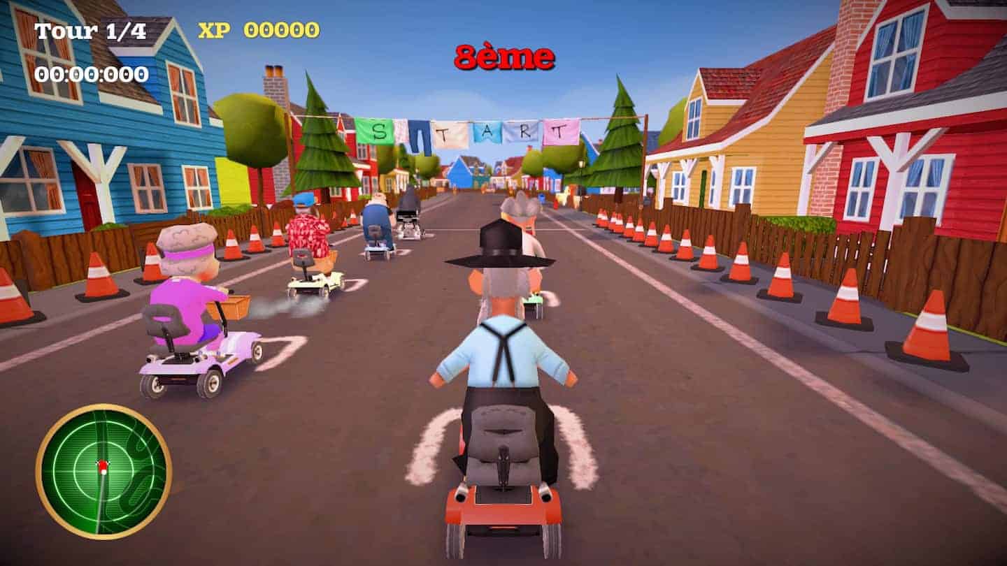 La mort vient prendre son dû dans un village de vieux, et ceux-ci lui proposent un défi pour sauver au moins l’un d’entre eux : une course de caddie ! J’adore ! Le jeu reprend les bases d’un Mario Kart, des courses ultra courtes, nerveuses et agrémentées de bonus qui vous permettent de ralentir vos “amis”.