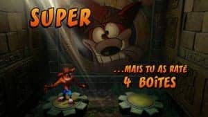 Au rayon des points négatifs, on en note très peu. Alors oui certains joueurs n’ayant pas connu la série originale n’adhéreront pas au concept et trouveront certainement les mécaniques éculées pour certaines. D’autres trouveront le jeu soit trop facile soit trop dur en fonction de là où ils viennent mais c’est ça Crash, un concept à lui seul qui avait défini l’identité de la première Playstation. Nous nous devons cependant de mentionner les temps de chargement. Ils sont longs…très longs…beaucoup trop longs je vous avoue pour un jeu pareil. Quand on joue à un jeu aussi dynamique, on a pas forcément envie de perdre le rythme entre les stages… patience donc.