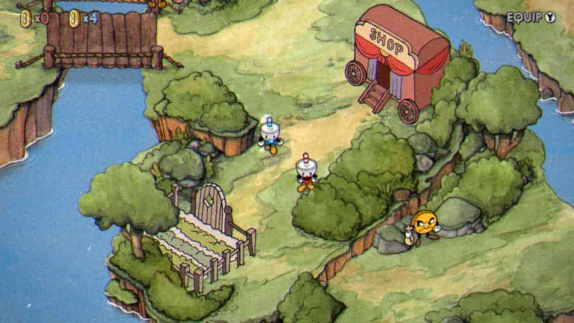 Pas besoin d’avoir une immense culture pour se rendre compte que Cuphead s’inspire plus qu’ouvertement des dessins animés des années 30-40. Et pas seulement dans le style graphique mais aussi dans ses personnages ou ses musiques. L’histoire servant de fil rouge à ce jeu de type boss fight est elle aussi tout à fait dans le ton. Vous êtes Cuphead, une gentille petite tasse anthropomorphe aux allures de jeune garçon mais ayant tout de même l’âge d’aller jouer au casino apparemment. Si, comme moi, vous décidez de vivre l’aventure à deux joueurs alors votre acolyte incarnera Mugman qui lui ressemble comme deux gouttes de thé mais en bleu.