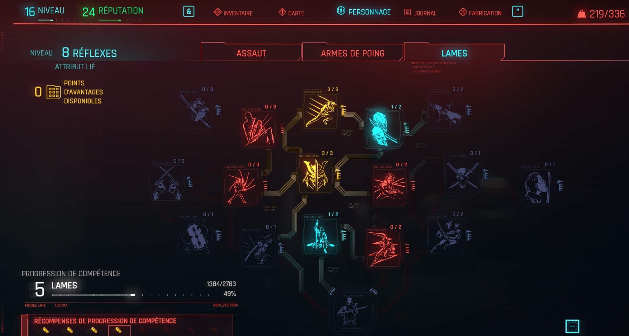 On l’a déjà vu à maintes reprises : les jeux de type FPS qui ajoutent une dimension RPG. Je pense notamment aux excellents opus de la licence Borderlands qui ont été pour moi mes premiers FPS/RPG. Looter des armes ou de l’équipement à chaque fois meilleur que ce qu’on porte actuellement, un réel plaisir. Et Cyberpunk 2077 le fait encore mieux puisqu’il pousse le côté RPG dans ses derniers retranchements. On retrouve bien évidemment un nombre incalculable d’armes de poings, mitraillettes, fusils d’assaut, à pompe ou encore de précision mais surtout DES LAMES. Et chaque catégorie d’armes dispose de son propre arbre de compétences dans lequel vous pourrez choisir d’augmenter… vos compétences. Par exemple la vitesse d’exécution d’une frappe avec un katana ou les dégâts infligés par votre SMG… Mais aussi votre constitution donc votre vie max, endurance ou encore vos capacités de piratage.