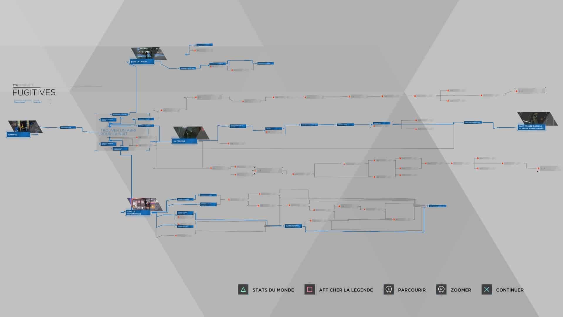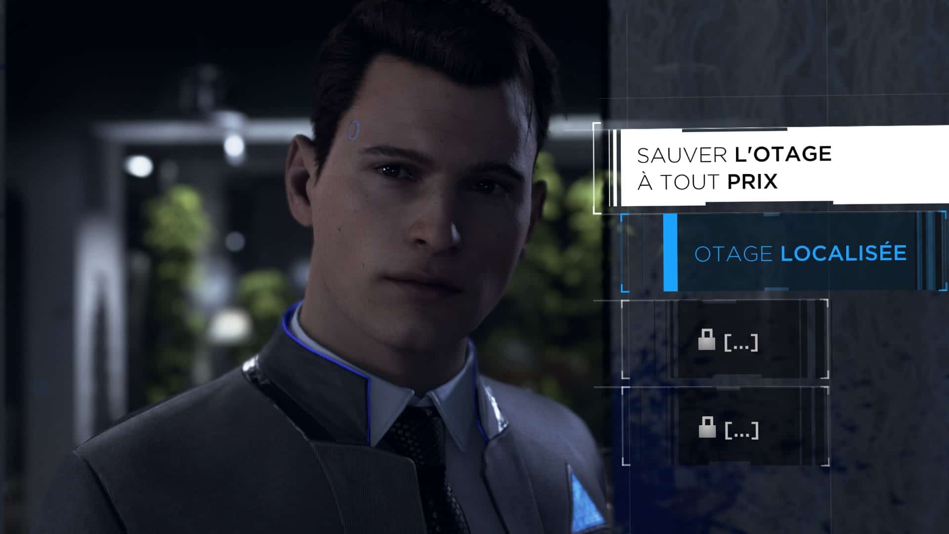 Tout d’abord, sa narration. La fin de chaque scène de Detroit : Become Human propose une arborescence des (très) nombreux choix et embranchements possibles. Si quelques-uns restent timides, la majorité s’avère étourdissante. Fuir, attaquer, tuer, patienter, protester, ne rien dire, débloquer telle voie, passer à côté de telle autre… On se retrouve dans un énorme labyrinthe de possibilités qui ne donnent qu’une envie : y replonger depuis le début pour voir ce qu’on a manqué. Toutes les expériences qui me sont parvenues, ainsi que les miennes, confirment le potentiel de rejouabilité de Detroit. S’il ne faut compter que 8 à 10 heures pour boucler l’aventure, il est possible de la relancer une à deux fois sans trop de redite. Si les variables ont toujours fait partie de la philosophie gaming de Quantic Dream, le studio est aujourd’hui au sommet de son art.