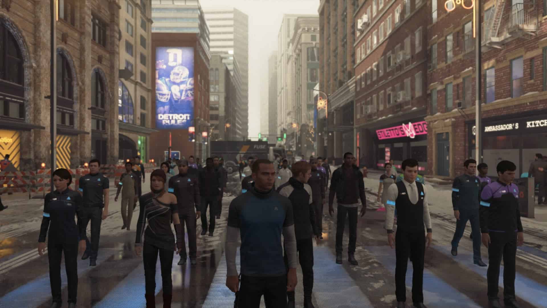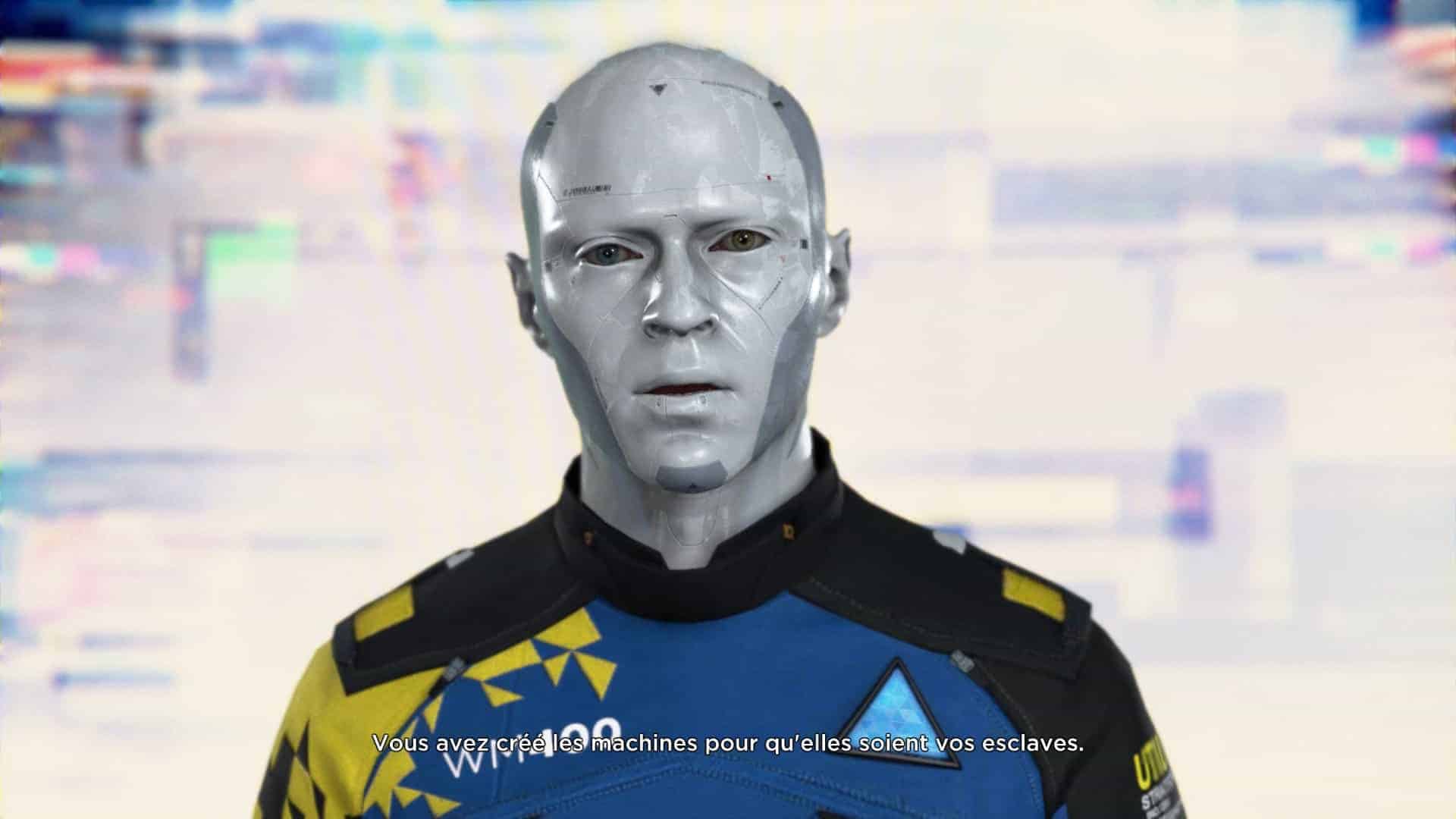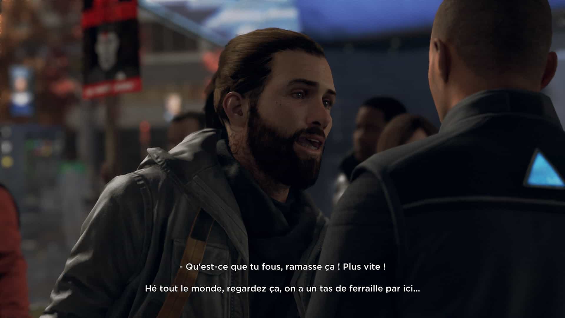 Quand j’affirme que l’écriture est meilleure que dans Heavy Rain, c’est à moitié vrai. En effet, les débuts de Detroit : Become Human sont prometteurs. Ils posent les enjeux d’une société post-moderne confrontée à la menace fantasmée de son extinction face aux machines (un peu comme les adeptes du Grand Remplacement). De nombreux humains sont irrationnels, effrayés par leur vision étriquée de l’Histoire, de l’humanité et de la civilisation. Les machines représentent une menace. En parallèle, celles-ci développent ou miment une conscience et donc des besoins primaires attribués aux humains. Les androïdes souhaitent vivre, être libres, aimer, et toutes ces émotions vitales essentiellement humaines. Le concept, loin d’être original, demeure intéressant, en particulier à notre époque. Et Detroit aborde ces questions de manière intéressante, du moins dans un premier temps.