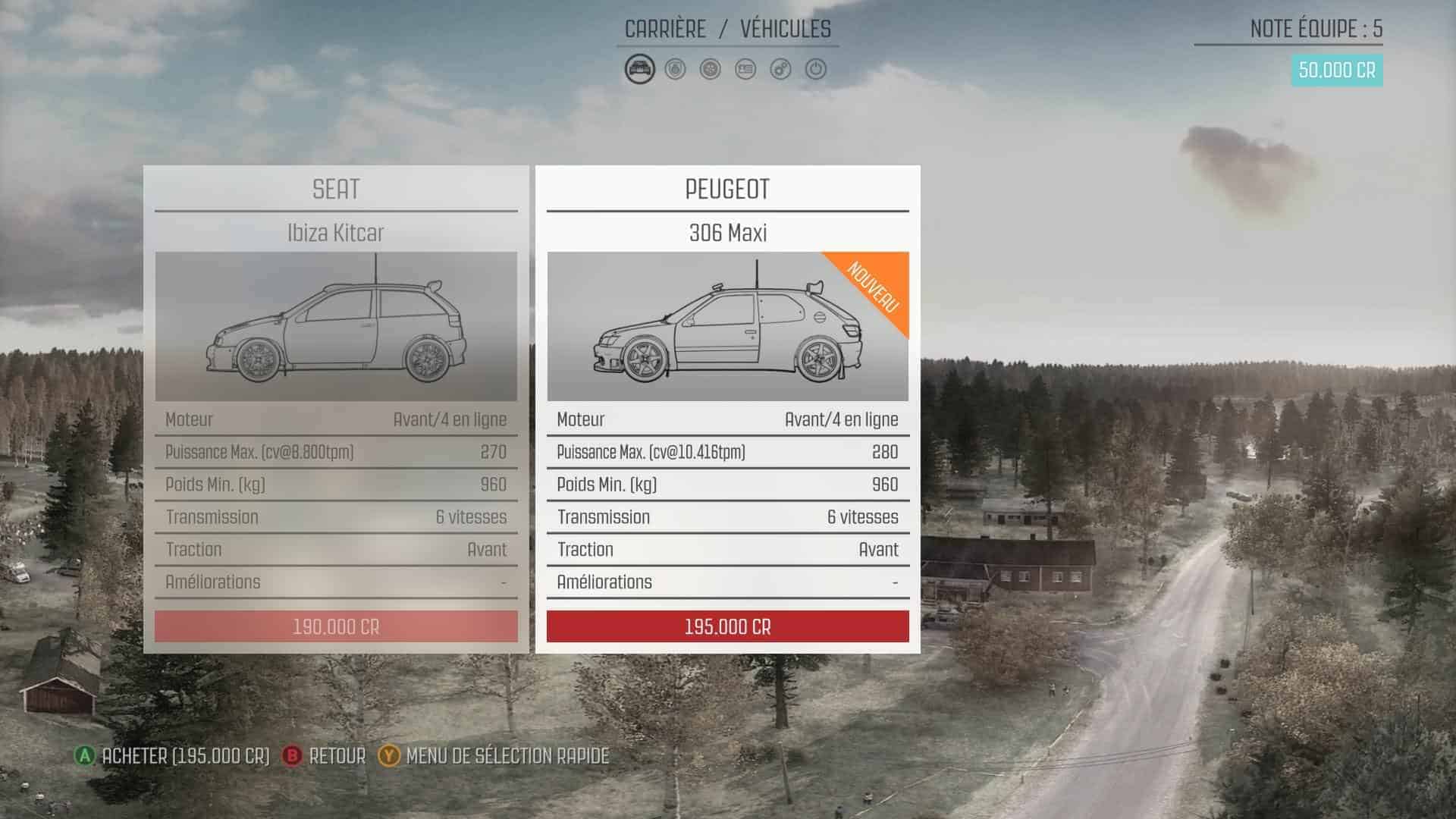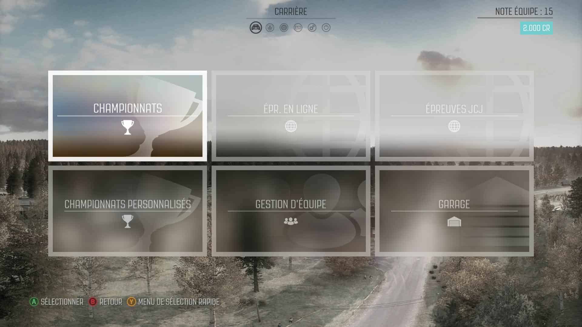 Lors de la première épreuve du championnat de rallye, vous avez le choix entre 3 voitures disponibles (pour ma part j’ai opté pour la mythique Renault Alpine). A partir de là, votre but sera de vous placer le mieux possible dans toutes les courses auxquelles vous participez pour remporter le plus de crédits possibles.