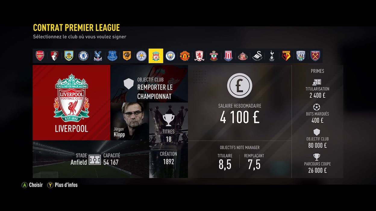 La suite est logique, vous brillez et l’on vient vous proposer des contrats. L’agent qui vous propose un contrat a d’ailleurs une étrange conception d’une ou deux propositions. En effet ce n’est pas loin de 20 équipes de premiere league qui vous seront proposées. Elles auront chacune leur difficulté selon les requêtes du manager. Personnellement j’ai choisi Everton car cela me semblait un bon compromis entre gain et difficulté.