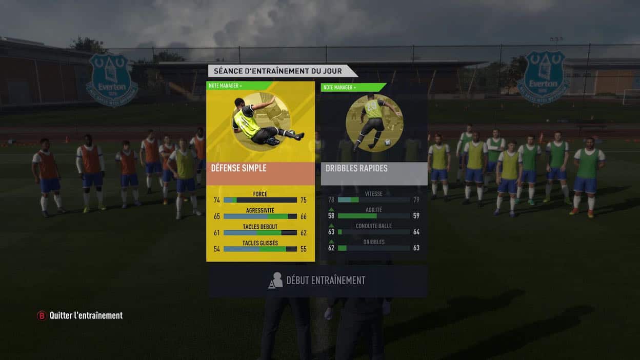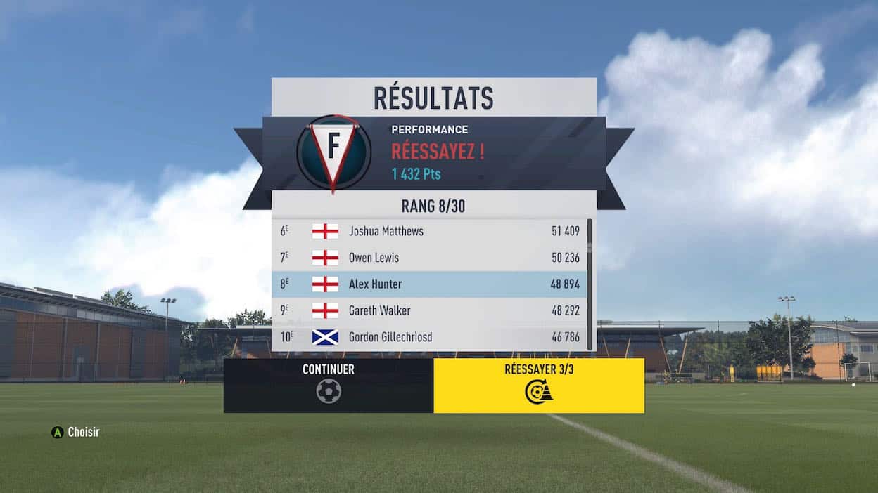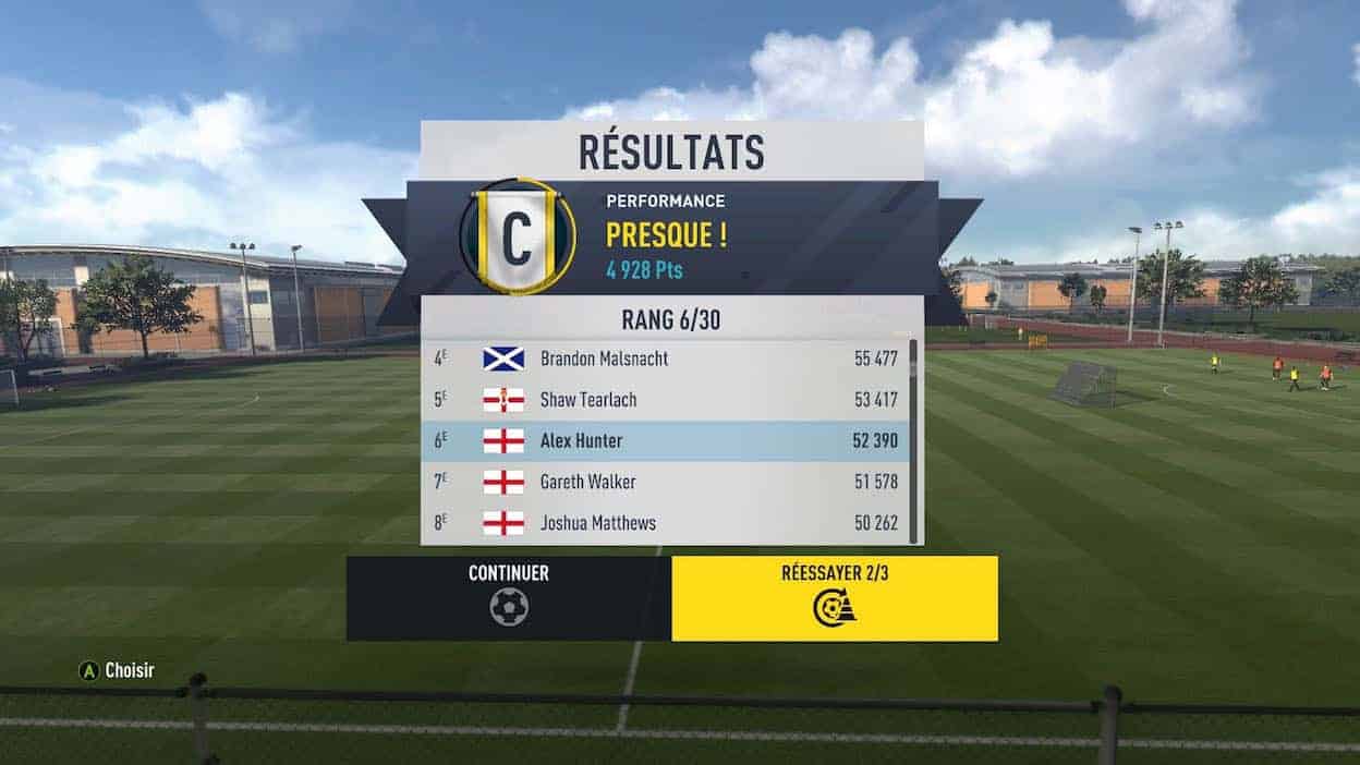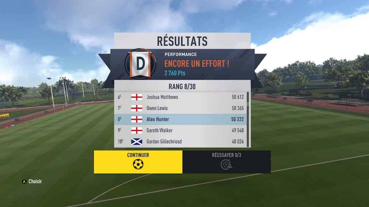 La journée se compose d’une première mi-temps contre des joueurs pro, des phases d’entrainement et enfin une dernière mi-temps pour les 10 meilleurs de la journée, dont vous devrez bien sûr faire partie. Pour ce qui est des entraînements, pas de stress vous aurez le droit à 3 essais Petit détail cependant, si vous recommencez un entraînement et que vous faites un score moins bon, pas de retour en arrière. Moi j’aime bien cette idée, cela vous fait fort hésiter si vous avez déjà péniblement atteint un B.