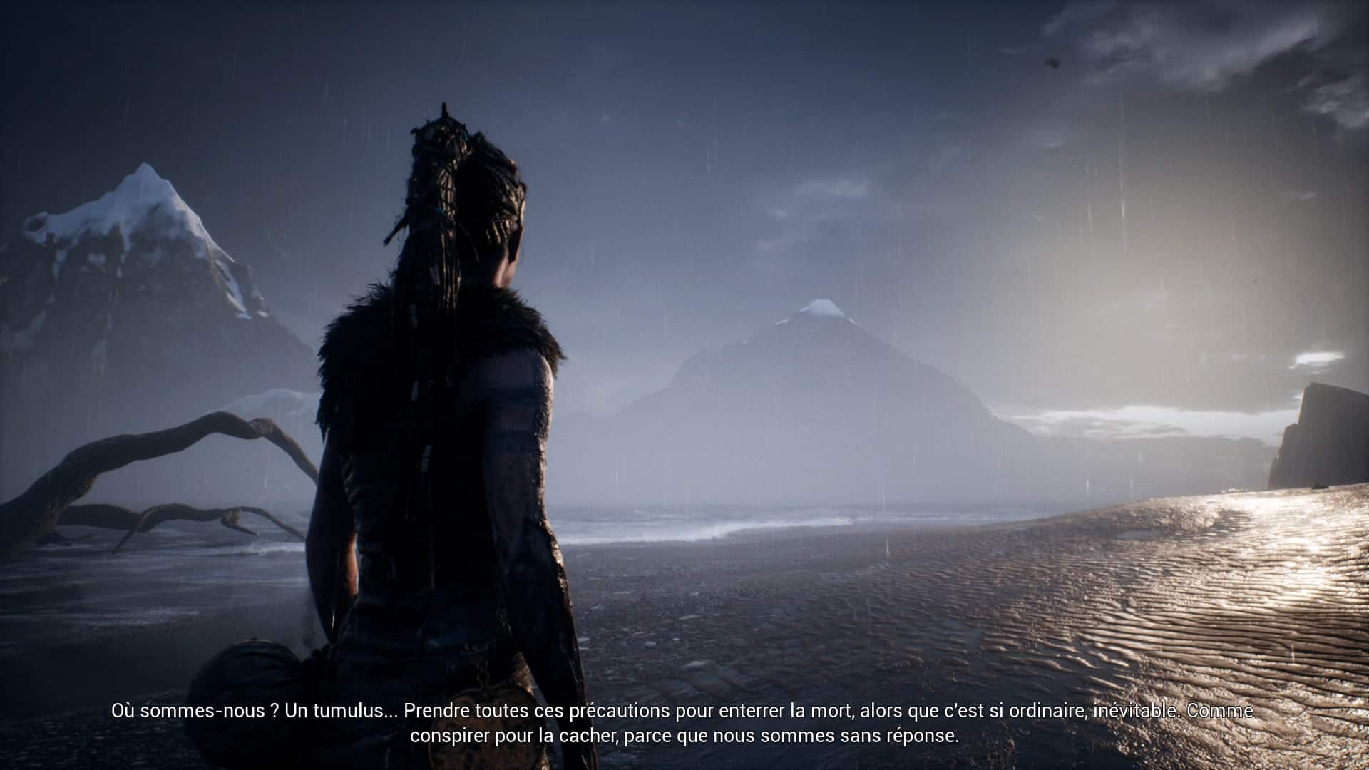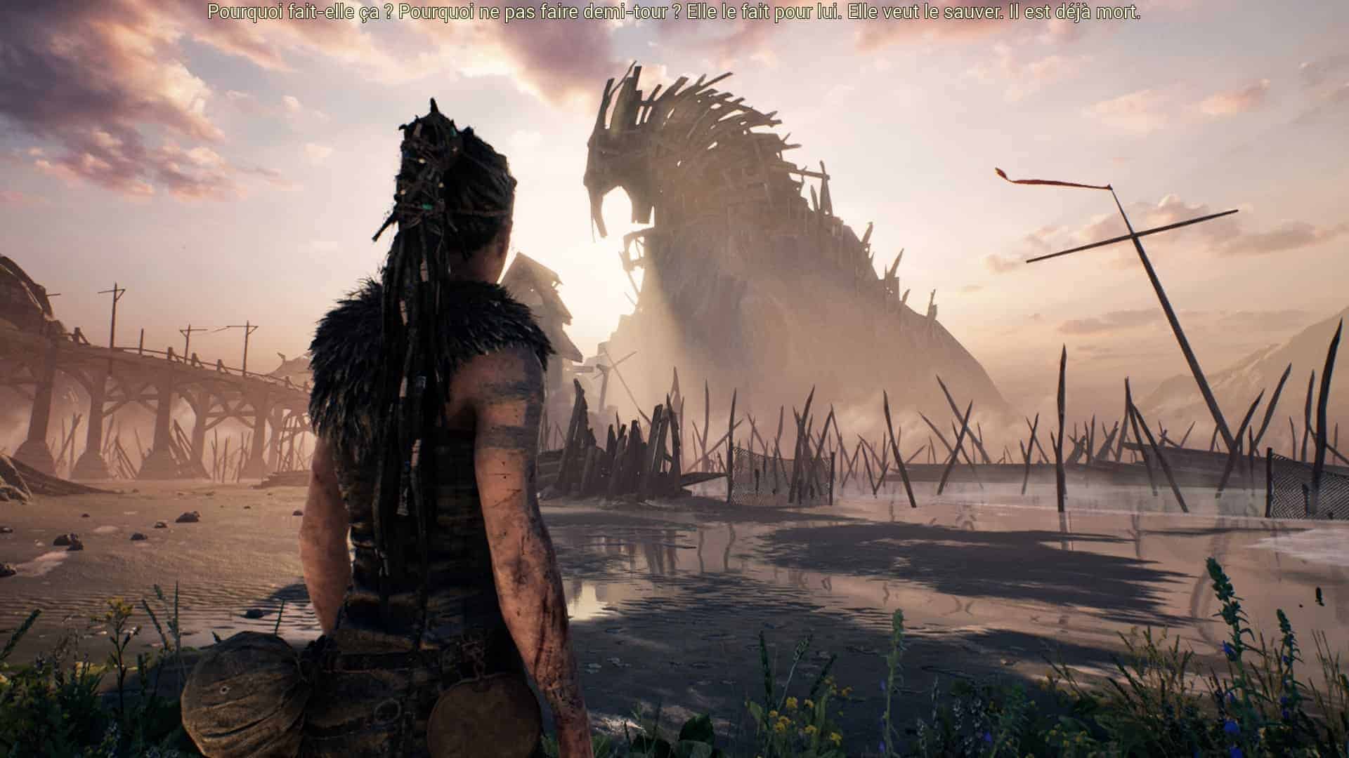Développer son propre jeu, qui plus est digne d’un triple A, sans l’aide d’une grosse boîte est un choix audacieux. Que dis-je ? C’est de la folie ! Ninja Theory a décidé de relever le défi et mon Dieu que c’est beau ! Si tous les jeux indés pouvaient avoir la carrure de Hellblade : Senua’s Sacrifice… enfin, une carrure qui n’est pas sans défauts mais qui en jette malgré tout. Techniquement, le jeu est fluide, les textures pour la plupart bluffantes, les dreadlocks de Senua crédibles. Et je ne vous ai pas parlé des vagues qui s’échouent sur des plages désolées et se dissipent avec le plus bel effet. Mais la star graphique du jeu, c’est Senua. Son visage, sa stature, ses animations, ses traits faciaux qui célèbrent la réalisme et forcent l’empathie. Hellblade est un beau jeu, tout simplement.