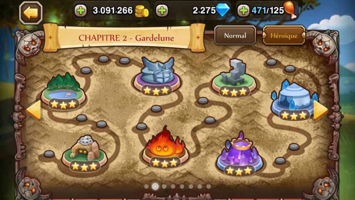 Là où Soul Hunters fait fort c’est sur le coté progressif du jeu. Au fur et à mesure des combats vous gagnerez de l’expérience de groupe qui vous débloquera de nouvelles zones. Et il y en a vraiment un paquet ! Ce qui fait que vous pouvez jouer pas mal de temps avant d’avoir l’impression de tourner en rond. Mode campagne, Creuset de feu, Arène, Combat de Boss… Vous aurez vraiment le loisir d’aller où bon vous semble dans ce petit monde. Même si le système de combat est toujours identique c’est plaisant de pouvoir utiliser les héros dans plusieurs modes différents.