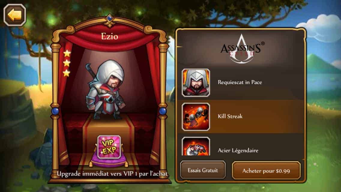 Détail assez comique c’est qu’au final Ezio n’est même pas dispo gratuitement. Il n’est pas très cher non plus puisque pour 0,99€ vous pourrez l’avoir en 3 étoiles et il faut avouer que c’est un ennemi redoutable. Malgré cela je suis resté accroc au système de combat et à l’ouverture de coffres pour espérer recevoir le combattant rêvé qui me permettrait de tenir face aux joueur qui investissent dans les persos payants.