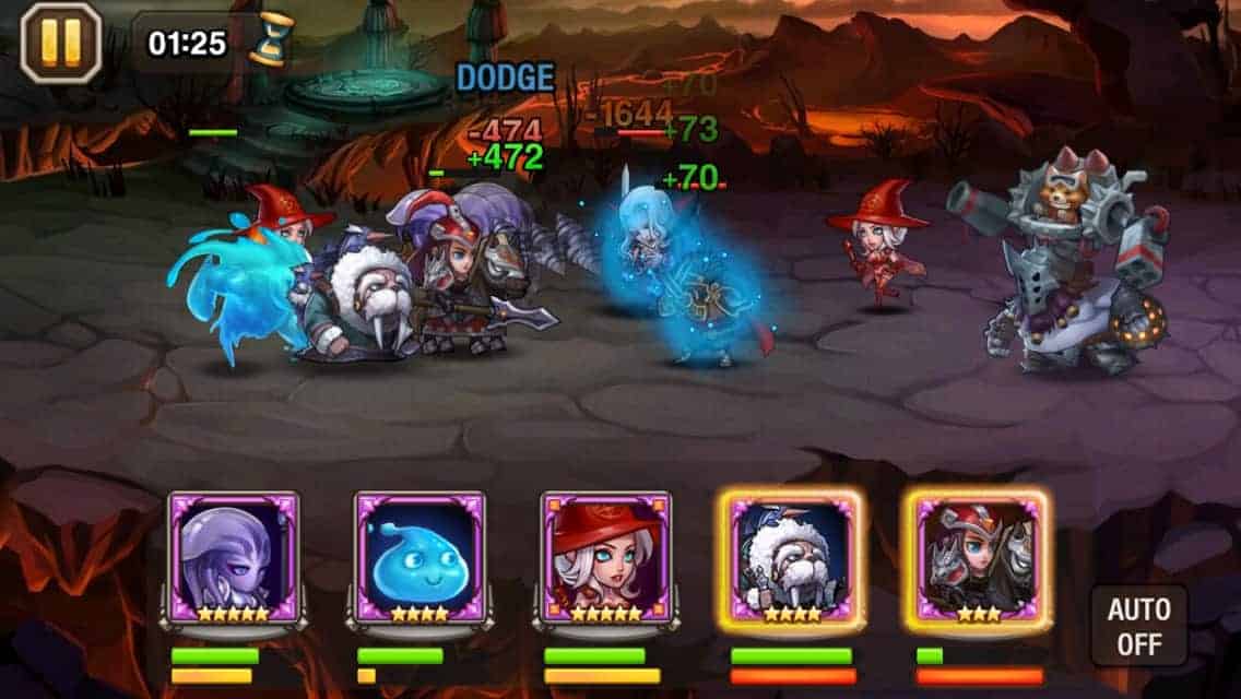 Quand on en vient au gameplay dans ce genre de jeu c’est souvent ressemblant. Soit des couleurs à assembler, soit des persos à aligner et matraquer l’écran pour tenter de gagner. Ici Soul Hunters ne révolutionne rien et va au plus simple mais cela reste agréable. Il vous suffit de choisir 5 héros parmis ceux que vous avez en stock et ensuite les laisser combattre. Vous aurez juste le choix d’utiliser votre attaque ultime au moment qui vous semble le plus opportun, en sachant que les combats du mode histoire se déroulent pour la plupart sur 3 rounds, il vous faudra parfois résister et attendre la dernière seconde pour exploser le champ de bataille.