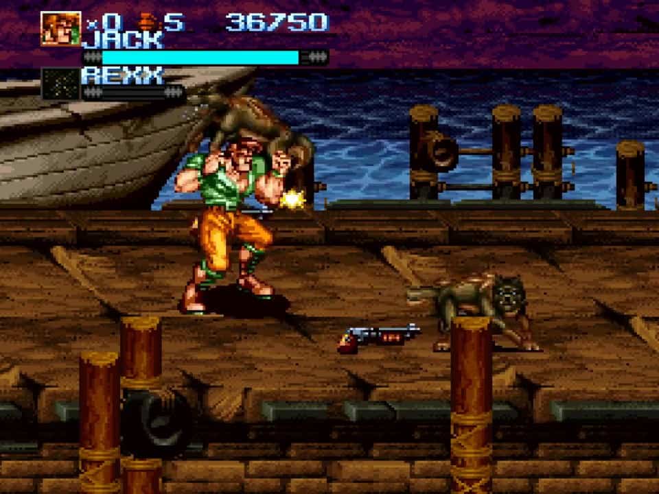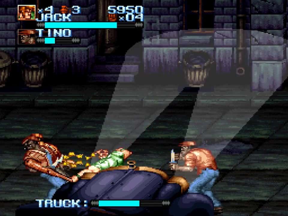 Vous avez directement le choix entre un des deux héros du bastion du fameux Iron Commando, à savoir Jake ou Chang Li. Le premier, stéréotype du héros américain 90’s a des prédispositions au maniement des armes et à la baston pure et dure, là où le second, joue davantage sur le pugilat technique et inspiré du maître asiatique. Quoi qu’il en soit, votre but est bel et bien de foncer pour castagner, à coup de frappes via la touche Y, de sauts via la touche B ou carrément d’attaques spéciales en appuyant simultanément sur Y et B. Vos ennemis apparaissent souvent armés et vous pouvez récupérer leurs armes, dont une batte de baseball, un couteau, un riot-gun, une kalachnikov et j’en passe. Mieux, certains passages vous embarqueront sur des véhicules fonçant à toute allure, rappelant les sensations d’un shoot’m up dès qu’il sera question d’éviter les attaques ennemies.