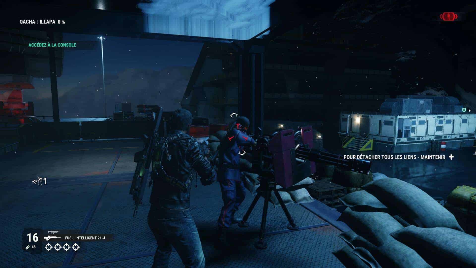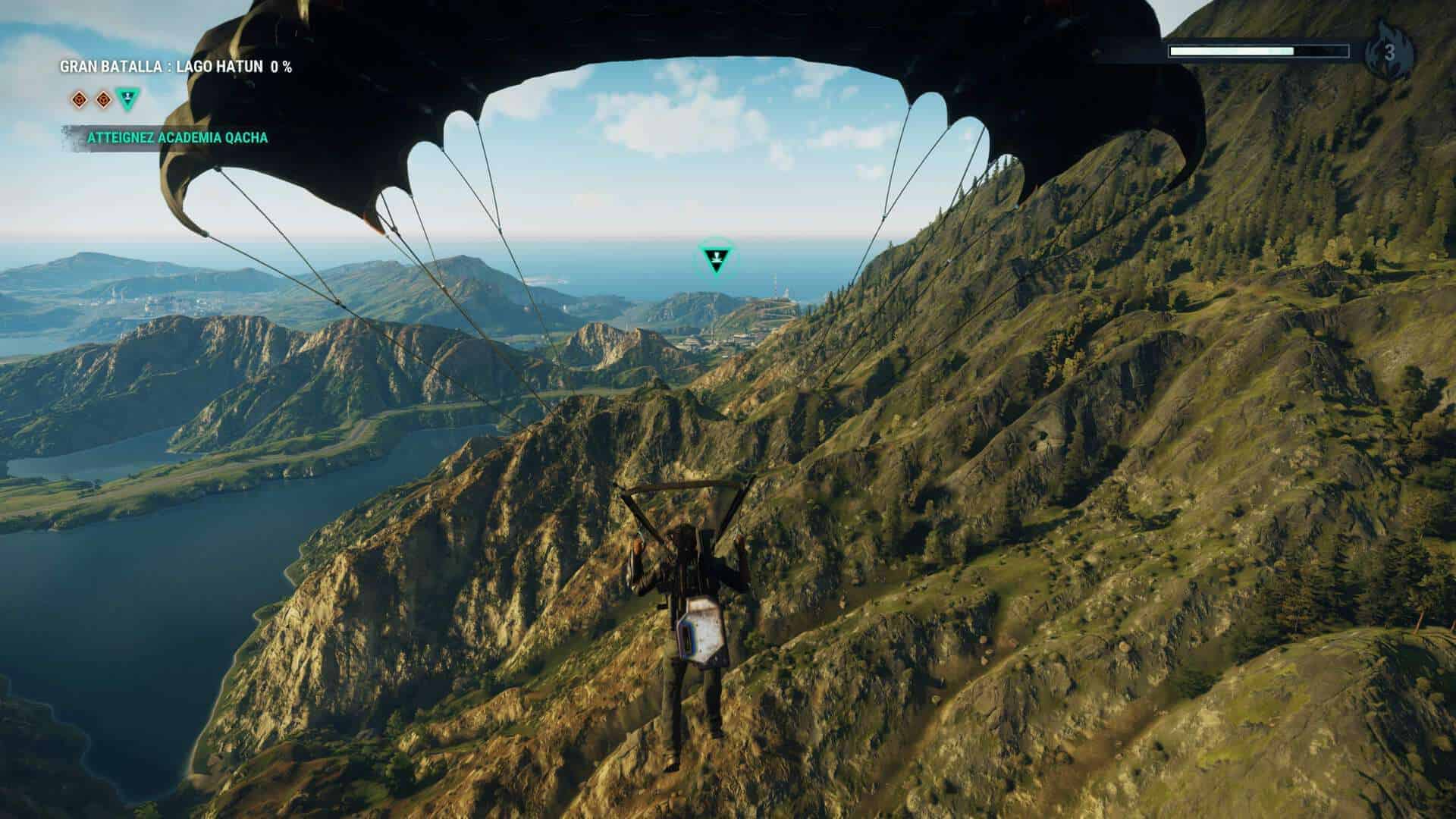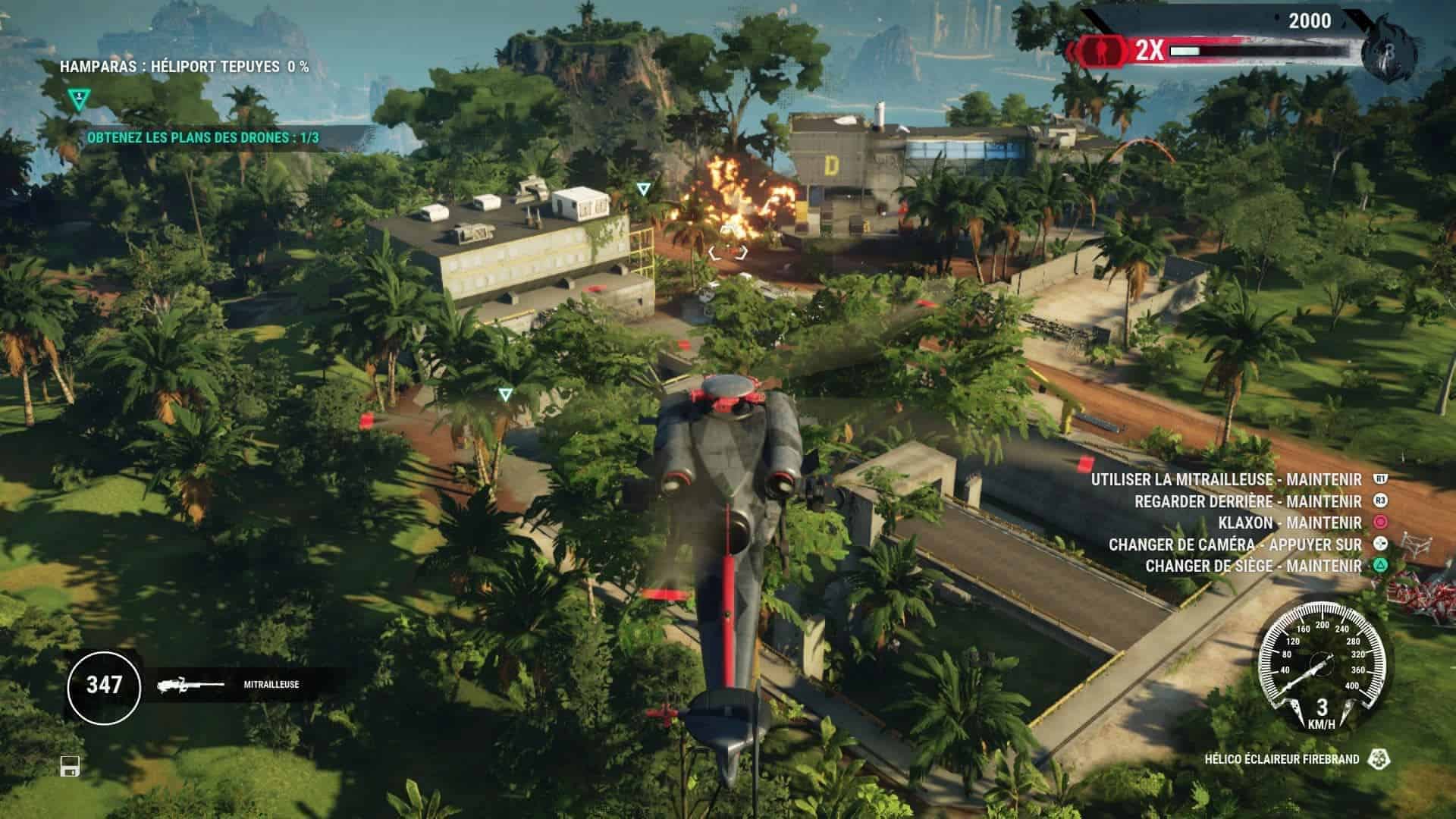 Pour vous déplacer, le combo grappin-wingsuit-parachute sera toujours votre meilleur allié afin de parcourir la map qui est juste énorme. N’hésitez cependant pas à repérer les hélicos, voitures puissantes ou encore avions de combat afin de voyager plus rapidement entre 2 points. Dans certains endroits ayant déjà été visités, il vous sera également possible d’effectuer un largage afin d’y arriver beaucoup plus rapidement. Le grappin bénéficie de certaines améliorations avec l’apparition du treuil, du ballon gonflable et des propulseurs. Intéressantes mais sous exploitées, les combats ne se prêtant pas toujours à ce genre de moyen de lutter plus lent. Petite déception également (ou alors j’ai raté un épisode) mais on note l’absence des bombes. Celles-ci étaient pourtant diablement efficaces dans l’épisode précédent.