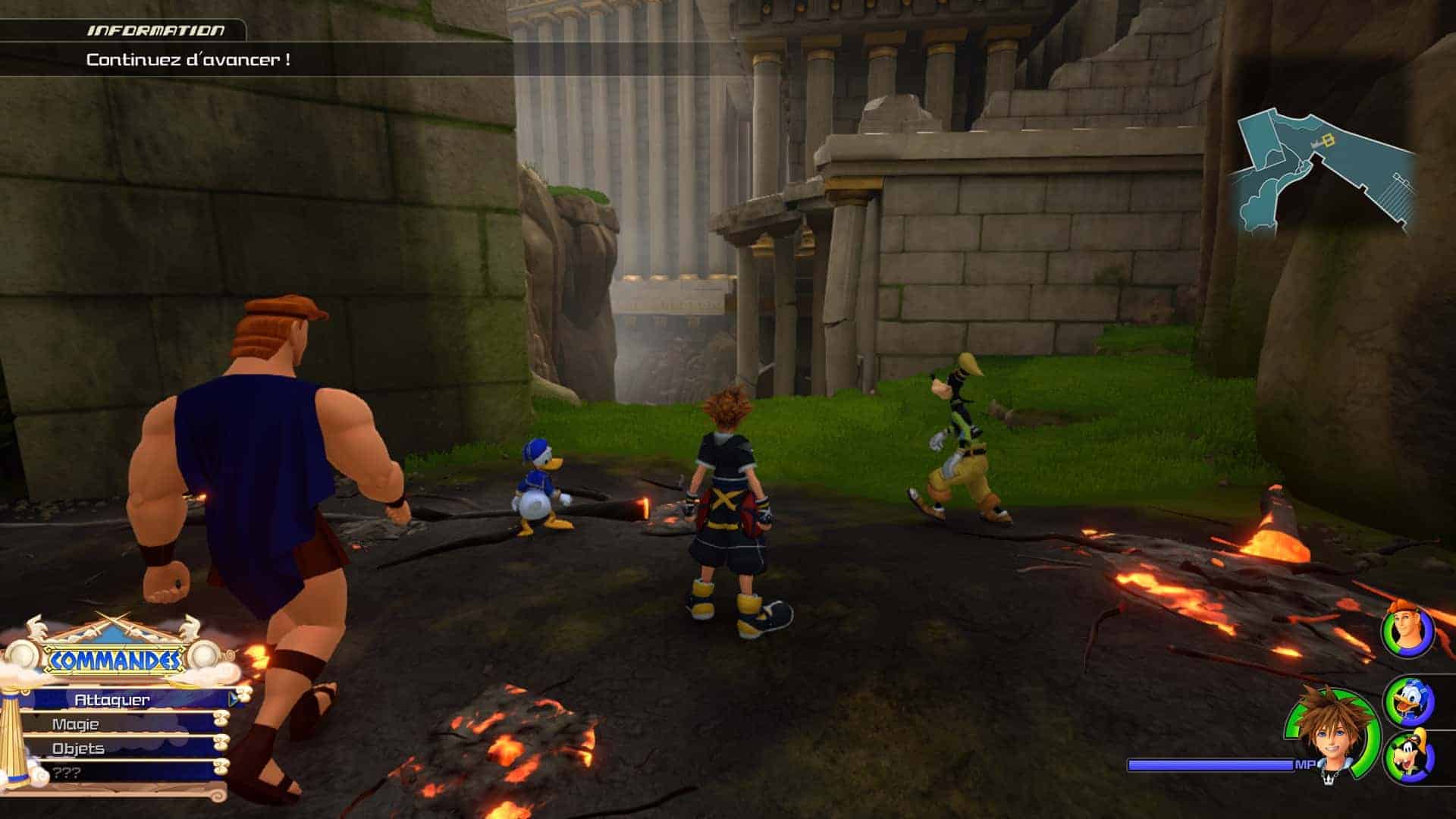 Pour en revenir aux cinématiques, elles sont bien trop fréquentes ! Vous ne pouvez pas tourner le coin sans vous en manger une. Le premier monde d’Hercule est de suite fatiguant, pour 3-4h de jeu dans ce monde vous en aurez au moins pour 2h30 de cinématique. J’aime Kingdom Hearts 3, mais j’ai envie d’y jouer pas de voir une série animée entrecoupée de petites phases de combats. Car le risque pour moi sera de très prochainement risquer d’appuyer sur “passer la cinématique”, ce qui serait dommage vu que l’histoire en soi est agréable.