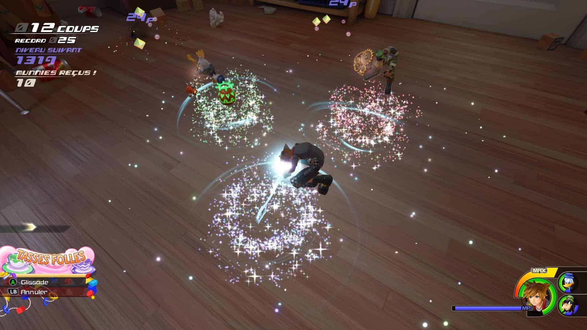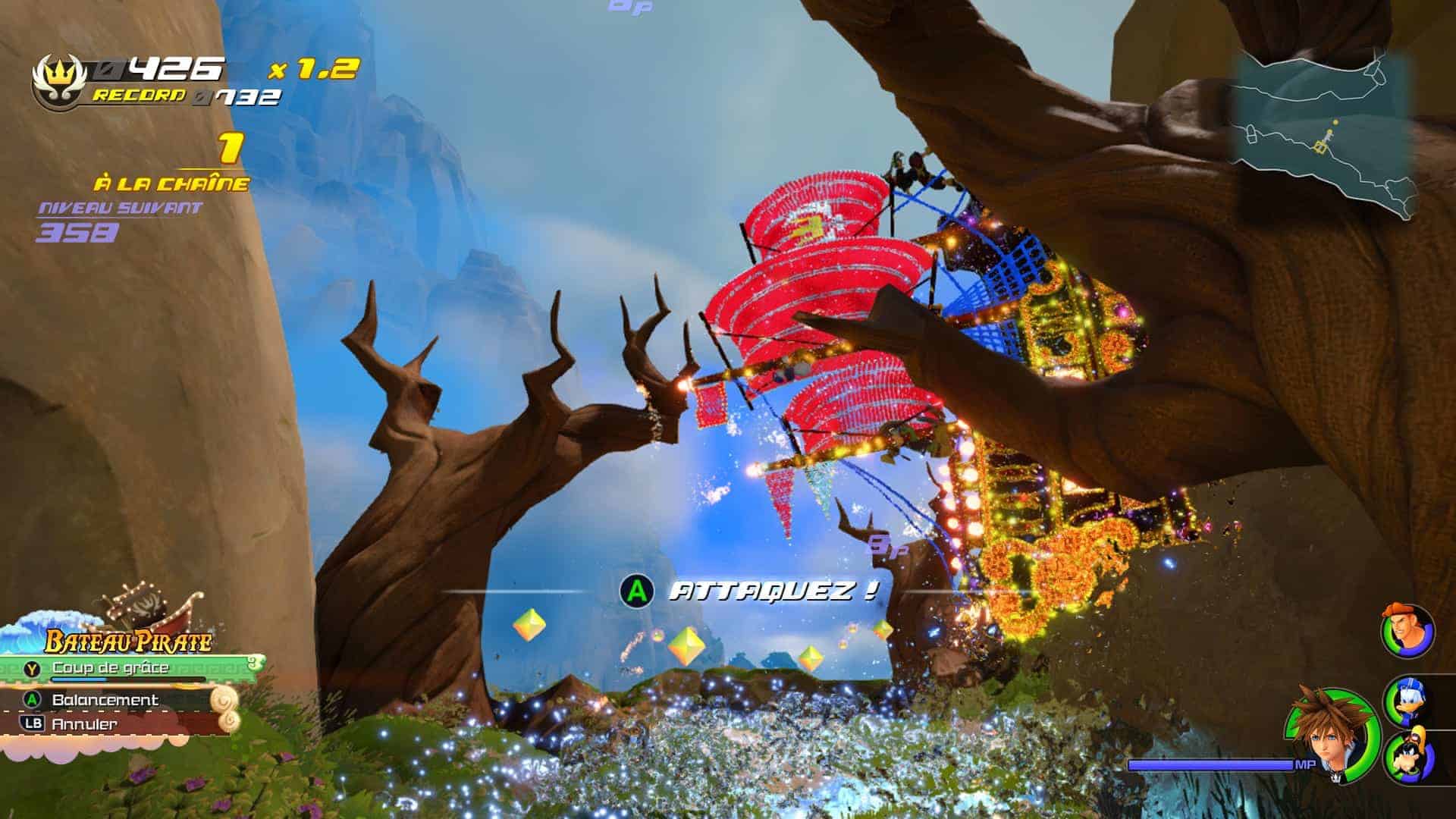 Parlons un peu du gameplay à présent. On reste sur le même principe que les volets précédents, c’est à dire que vous marchez un peu, rencontrez un groupe d’ennemis, les martelez à coup de KeyBlades et de feux d’artifice pour ensuite avancer encore et aller vers le groupe suivant ou un petit boss. Je dis ça comme si c’était négatif mais c’est juste pour que vous compreniez bien que ce n’est pas dans la façon d’amener les combats que le jeu brille. Pour ce qui est des diverses attaques elles sont assez bien variées et vous aurez droit (trop) souvent à des coups spéciaux qui représentent les attractions Disney. Kitsch à souhait mais hyper bien fichu. Simplement je les trouve trop présentes que pour être agréables.