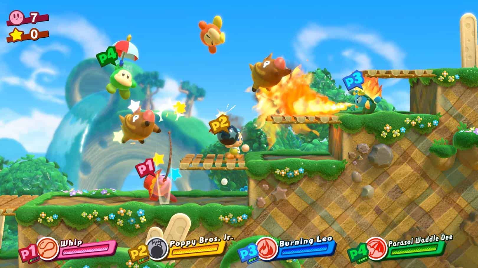 Sur les différents niveaux, Kirby peut récupérer les pouvoirs des personnages qu’il rencontre : cela démultiplie les possibilités de gameplay en amenant un tas de nouvelles compétences : avoir un balai, cracher du feu, être électrique, voler… En plus, vous pouvez recruter 3 personnages pour vous aider et combiner leurs pouvoirs : avoir un balai en feu, un boomerang électrique…