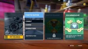 Arrivé au menu de départ, ce qui m’a de suite surpris c’est que le jeu semblait faire la part belle au mode online. Entre un mode événement spécial, un mode partie rapide, un autre match classé et un dernier mode escarmouche, tous semblaient online seulement. Je vous avoue avoir même essayé de changer d’écran, me disant que le mode solo ou carrière était plus loin mais non…il n’existe tout simplement pas. Une fois ma déception passée, je me suis laissé tenter par le mode partie rapide. Là on a les choix suivants : combat, course ou élimination. Pas folichon mais pourquoi pas.