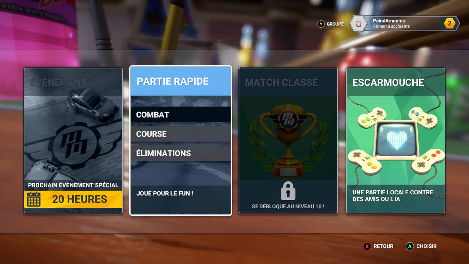 Le mode événement spécial vous permet de participer à des events tous les x temps avec un but précis afin de pouvoir améliorer votre classement, gagner des items et débloquer des autres véhicules. Pour ce qui est du mode match classé, je n’ai pas joué assez afin de pouvoir y participer, j’en ai eu marre avant. Enfin, le mode escarmouche vous permet de créer une partie un peu plus libre vous offrant le choix entre éliminations, chacun pour soi ou encore course. Un peu chiche il faut l’avouer et le fun est de courte durée. J’attendais beaucoup du mode éliminations, mode phare de ce genre de jeu mais encore une fois, j’ai été déçu. La conduite étant difficile, il est ardu de ne pas être éliminé au bout de 10 secondes lors des premières courses. Et lorsque vous y arrivez et que vous êtes tranquillement premier, vous pouvez malgré tout être éliminé si par malheur vous prenez trop d’avance et disparaissez de l’écran. Sans doute un problème de calibrage de caméra mais hautement frustrant.