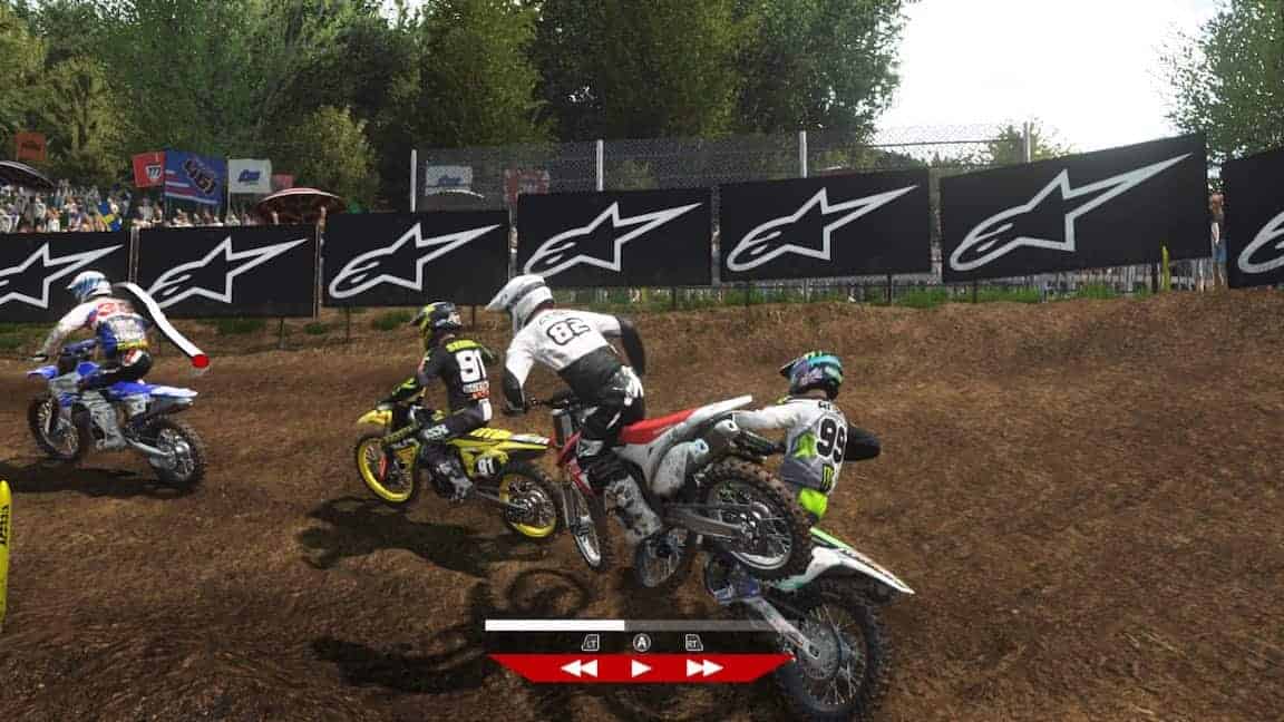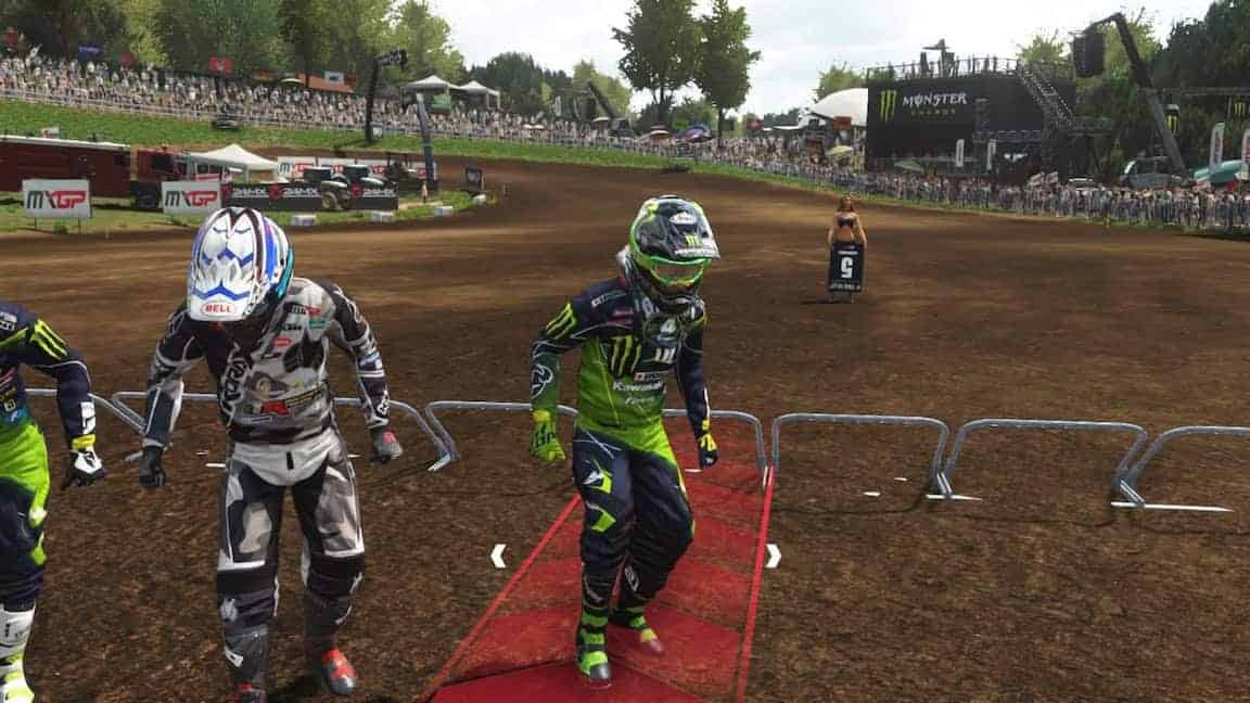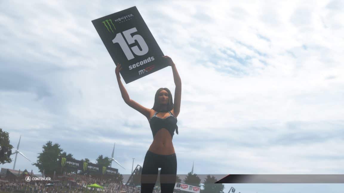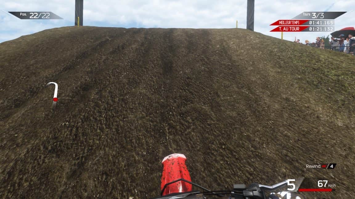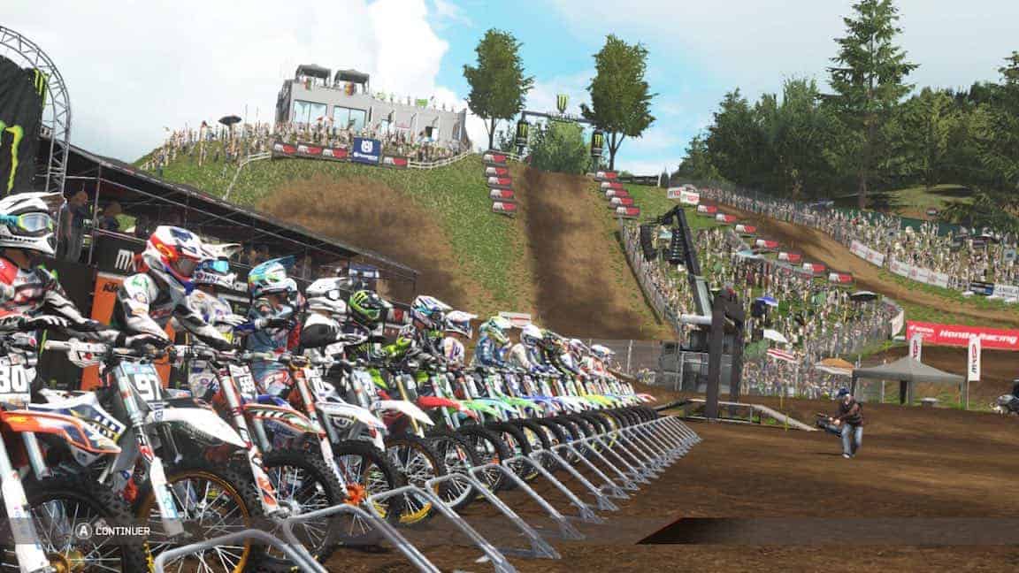 La première course démarre enfin après un loooong chargement. Essais, qualifs, course. Je me suis cassé la tête à foncer durant près de 10min en qualif pour tenter d’avoir une meilleure position sur la grille de départ. Et c’est là qu’on comprend à quel point je suis inculte dans le domaine du MXGP car tous les pilotes démarrent sur une seule et même ligne. Et s’il est vrai que démarrer plus à gauche vous permet de prendre le premier tournant plus court, il n’en est pas moins assez facile de doubler tout le monde dès les premières secondes, quelle que soit vôtre position de départ.