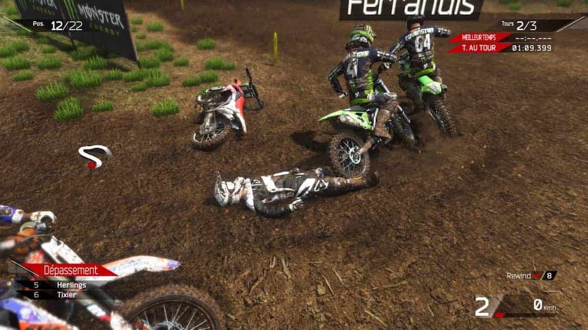 Pour faciliter un peu l’accès au débutants, il y a aussi des “rewind” qui vous permettent de rembobiner le temps de quelques secondes des fois qu’une chute vous ferait perdre de précieuses secondes. Je n’ai pas très bien compris pourquoi ces “rewind” sont limités à 9 par course mais pourquoi pas. Même moi je n’ai pas eu l’utilité de plus de deux ou trois. Du coup je pense sincèrement que les développeurs ont fait tout leur possible pour attirer les non-initiés. Pari réussi car contrairement à Moto GP où je n’arrive pas du tout à prendre du plaisir, ici je me suis étonné à m’avancer dans le fauteuil pour être plus concentré (comme si cela changeait quelque chose…)