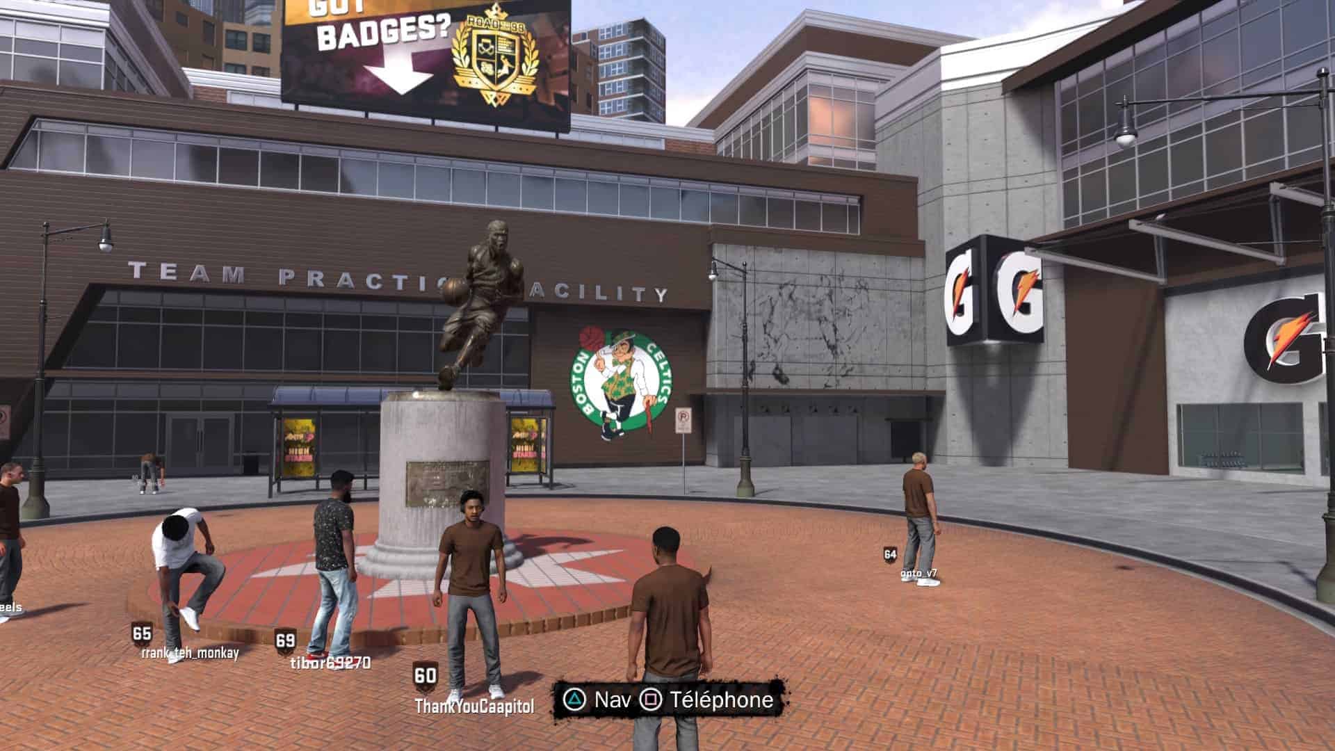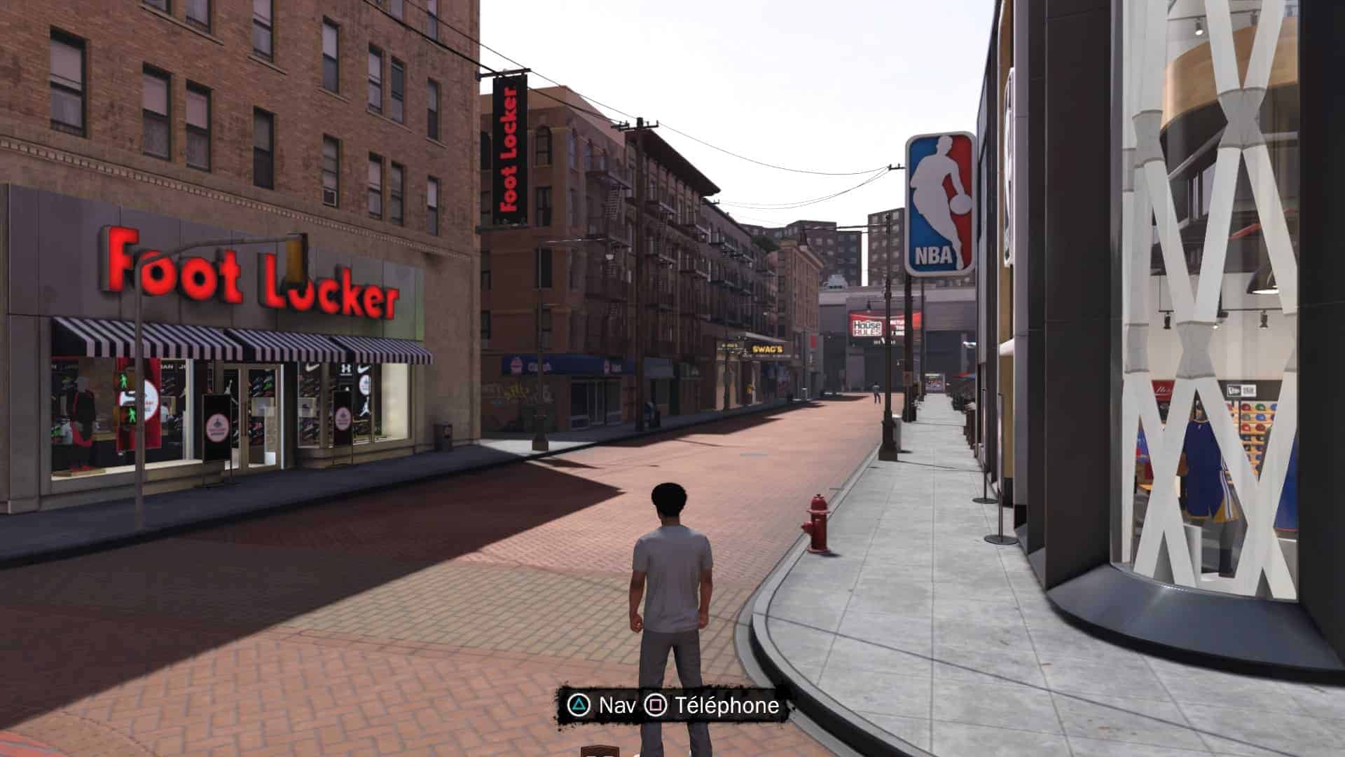 D’ailleurs, parlons-en un peu plus, de ce mode Ma Carrière. Je me demandais ce que nous avait concocté Visual Concepts cette année et j’étais intrigué par le Quartier (Run the Neighborhood), cette sorte de hub où vous déambulez librement entre les matchs. Vous pouvez vous y entraînez physiquement au Gatorade Training Center (ah, la pub agressive de la série est bien là !) ou y boire (mais ça coûte, fatalement) pour retrouver de l’énergie. L’entraînement de l’équipe vous attend aussi. Vous pouvez aller chez vous et jouer à NBA 2K18 avec votre perso (NBAception, trop fort !). Si vos cheveux poussent, le barbier n’est jamais bien loin. Et si vous vous ennuyer, les terrains en bêton du quartier n’attendent que vous… Après tout, c’est là que DJ, nouveau protagoniste du jeu, a été remarqué par les recruteurs NBA.