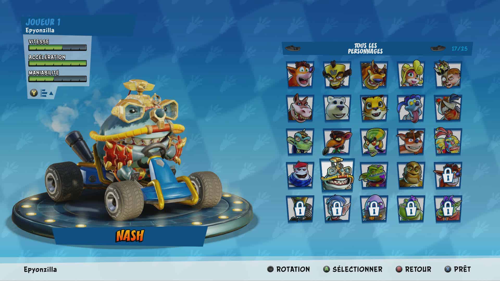 Dans l’épisode original, on disposait de 18 circuits répartis sur 5 mondes très différents ainsi que d’une douzaine de personnages. Ayant la volonté d’apporter un plus par rapport à l’original, les studios nous ont également amené tout le contenu de Crash Nitro Kart. Épisode nettement moins marquant mais ayant ses propres personnages, circuits et options de customisation. Ceci ayant pour conséquence de porter le nombre de personnages à 25, d’ajouter 13 circuits et de permettre au joueur de customiser son kart (à la manière de ce qu’a fait Sonic Team Racing récemment). Ça c’est pour le contenu de base.