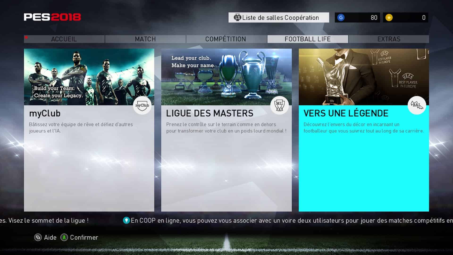 Soyons clairs d’emblée, lorsque l’on démarre PES 2018, on se retrouve toujours face à cette même interface évoluant très peu et assez classique. Personnellement ça ne me dérange pas mais un petit relooking ne ferait peut-être pas de tort. On fait ensuite le tour du propriétaire pour découvrir les différents modes disponibles : match rapide, match aléatoire, ligue des champions, Europa League, myClub, Vers une légende, en ligne ainsi que le mode entrainements. Franchement, je trouve le contenu plus que suffisant et je ne suis donc pas tout à fait d’accord avec tout ce que j’ai pu lire jusqu’à présent. Rien de révolutionnaire certes mais tout ce à quoi on peut s’attendre. J’ai toujours adoré le mode ligue des masters de PES et c’est avec grand plaisir que je l’ai retrouvé ici. Avec beaucoup plus de choses à gérer que précédemment pour toujours plus d’immersion. A vous le titre de manager de l’année.