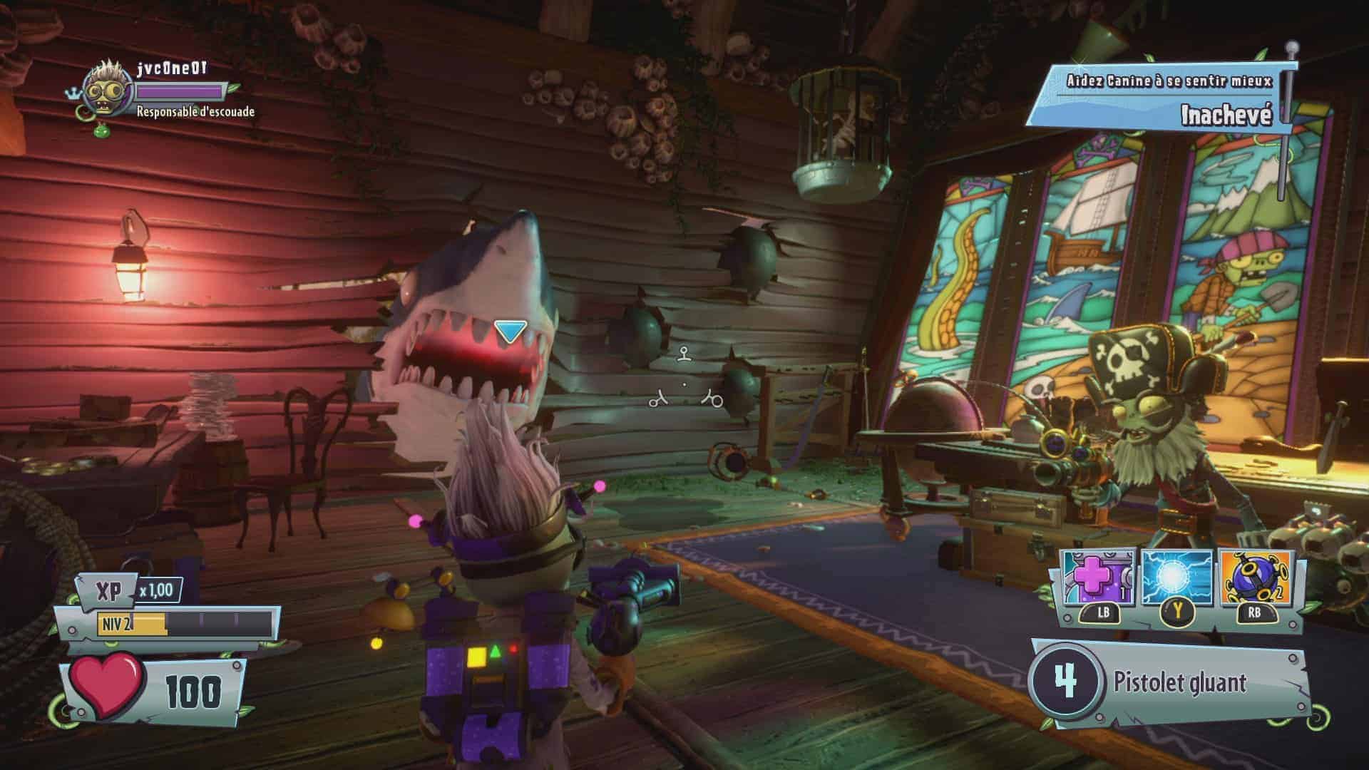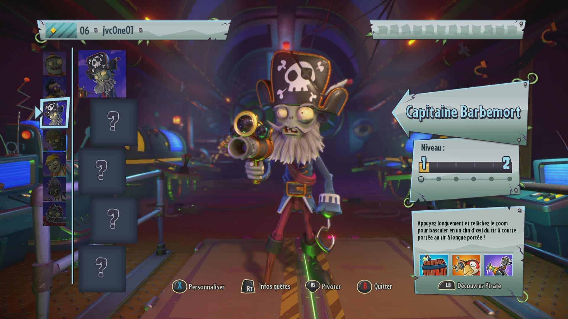 Je me suis donc d’abord essayé à « Jardins et Cimetières », dont le but est de prendre d’assaut des points de contrôle. Intéressant : la carte s’étend au fur et à mesure. J’ai beaucoup aimé les sensations, mais dans mon cas le mode “easy” convenait mieux, car sinon, je mourrais trop régulièrement. Dans la peau du pirate, mon personnage zombie favori aux capacités aussi dévastatrices qu’originales (courte et longue distance, transformation en baril explosif et en perroquet !), on se prend vite au jeu. Même si cela reste parfois fort difficile : on a du mal à établir une stratégie cohérente pour survivre plus de 30 secondes !