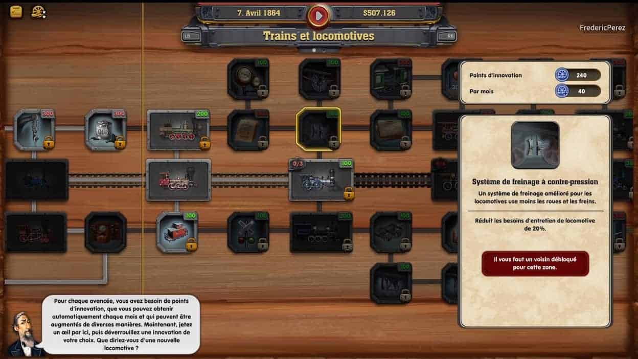 Jusqu’ici vous vous demandez peut-être en quoi Railway Empire est complexe ? Eh bien il offre juste trop de choix que j’estime dispensables mais qu’il s’avère pourtant obligatoire d’utiliser. Par exemple les feux de signalisation ou les déviations que vous devrez placer sans cesse vous même dans le bon sens sous peine de retrouver une bonne partie de vos trains à l’arrêt. Ou encore les arrêts d’entretien lors des longs trajets qu’il faut espacer correctement sans quoi votre locomotive se retrouvera en panne au beau milieu de nulle part. Et ne parlons même pas du système de choix de recherche. J’aurais préféré des nouveautés se débloquant avec le temps plutôt que de devoir encore faire le choix de tel ou tel innovation alors que j’ai déjà un parc entier de trains à gérer.