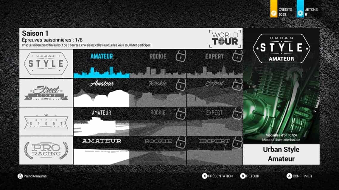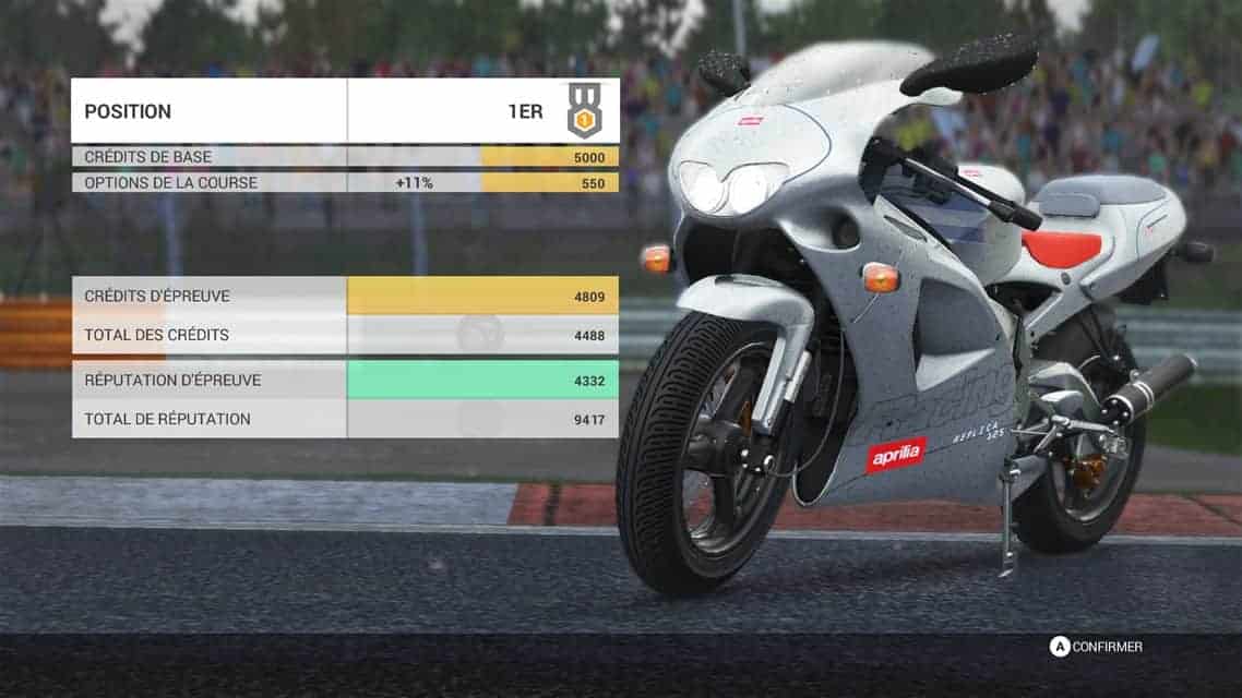 Tout d’abord, il faut avouer que là ou Ride 2 ne nous déçoit vraiment pas, c’est au niveau de son contenu. Vous aurez accès à pas moins de 190 motos et 30 circuits afin de parfaire votre pilotage. Réparties en plusieurs cylindrées (125, 600…) et différents types (super bike, hyper sport, routières…), vous devrez évoluer dans le jeu afin d’acheter de nouvelles montures et de franchir les échelons grâce à votre pilotage. Pas de mode carrière pour ce faire mais un principe de World Tour. Dans celui-ci, vous devrez acheter des motos de plus en plus puissantes et rejoindre les courses accessibles afin de gagner des crédits et de la réputation. Personnellement j’aime beaucoup car cela donne une belle durée de vie au jeu et vous donne la possibilité de progresser à votre rythme. Imaginez devoir attaquer directement avec une R1 ? Autant se faire les dents sur une petite Aprilia RS 125 non ?
