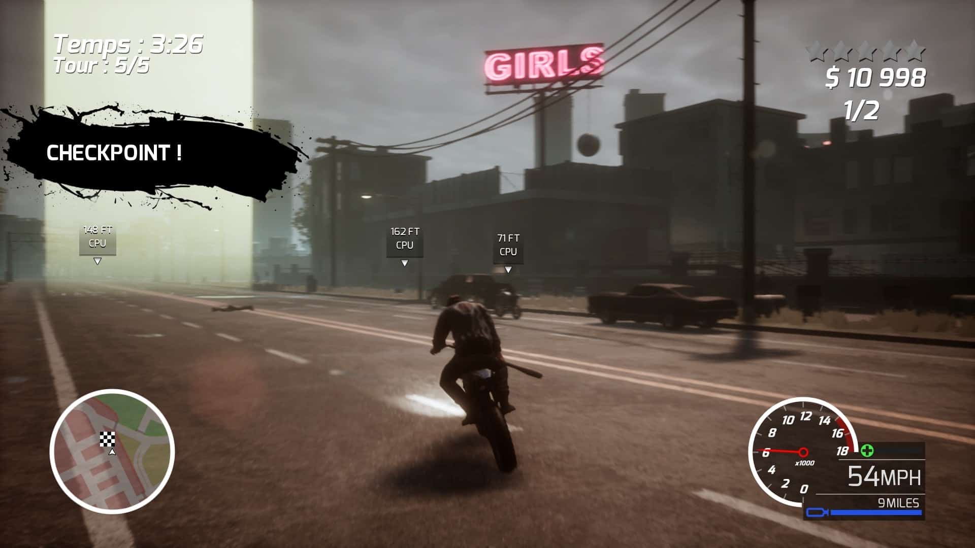 Car sur papier Road Rage reprenait un principe qui me plaisait vraiment. Le jeu consiste simplement en une suite de courses de bécanes où tous les coups sont permis. Mais ici les développeurs ont eu envie d’améliorer ce système en nous proposant une carte en monde ouvert donnant accès à diverses “missions”. Mais quelle que soit l’excuse utilisée au final le résultat reste plus ou moins le même : foncer et taper. Ce qui est de toute façon ce qu’on demande au jeu.
