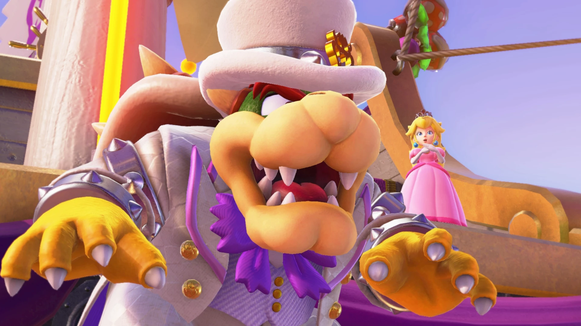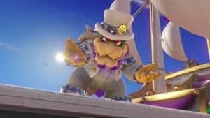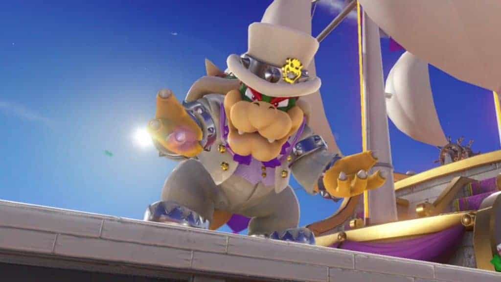 Pour le pitch (j’ai failli dire peach mais j’ai pas osé), celui-ci est très simple bien qu’un peu différent. Une fois n’est pas coutume, Bowser a décidé de kidnapper la princesse Peach. Cependant, cette fois-ci, il a décidé de l’épouser de force et de s’emparer au même moment de la sœur de votre nouvel ami de circonstances, Cappy, sorte de chapeau magique, qui est bien décidé à combattre Bowser à vos côtés. L’objectif étant de récolter des lunes afin d’alimenter votre vaisseau, l’Odyssey, en énergie pour pouvoir suivre Bowser à travers les différents mondes.