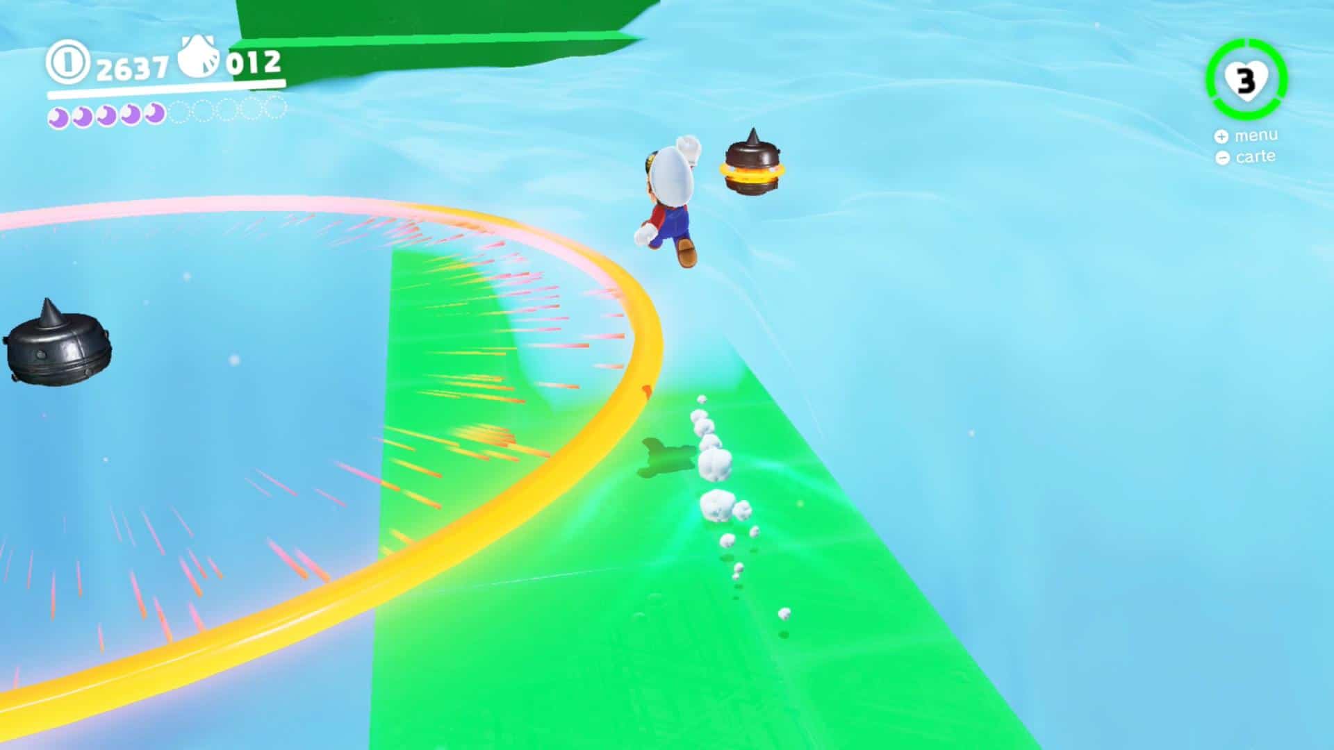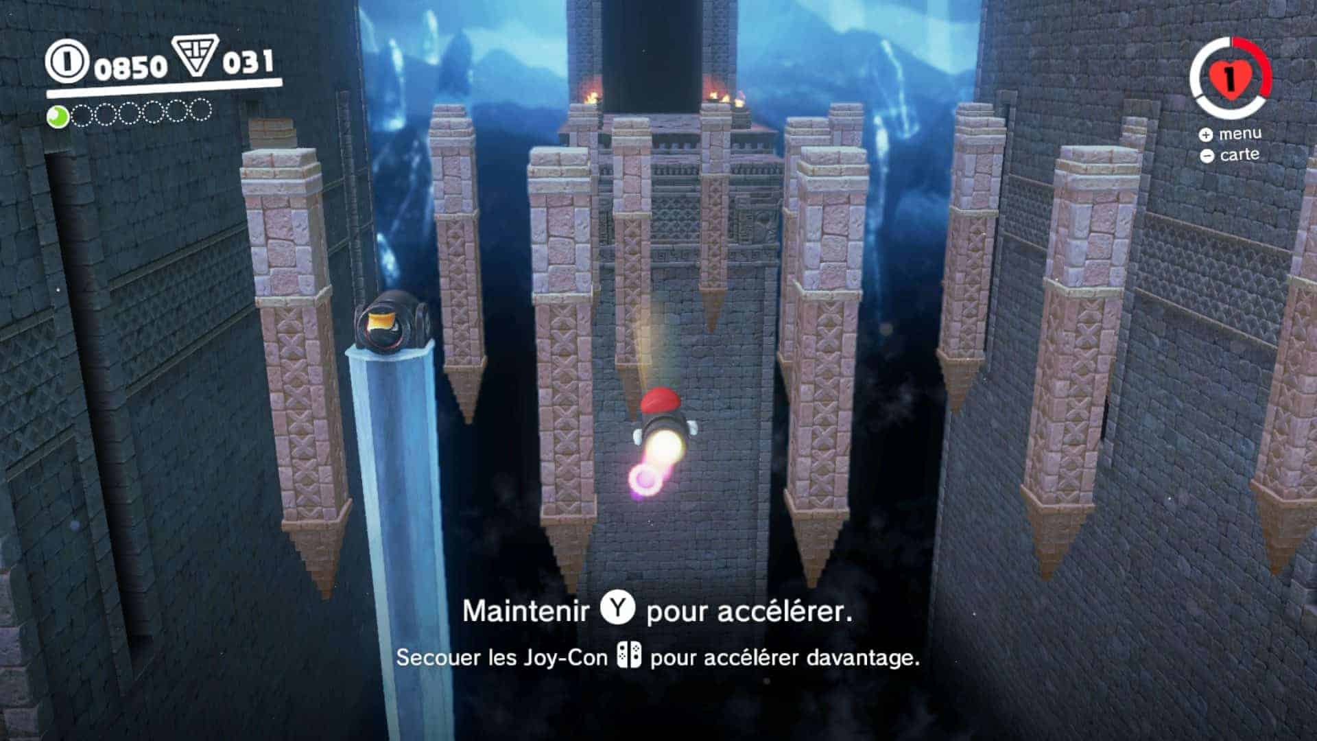 La grande nouveauté c’est le pouvoir de votre casquette, j’ai nommé Cappy. Exit les fleurs, feuille et autres items capables de vous donner un pouvoir spécifique temporaire. Ici, votre casquette est vivante et peut servir à fracasser les ennemis d’une part. D’autre part, grâce à la chapimorphose, Cappy vous permettra de prendre le contrôle de nombreux objets et autres ennemis rencontrés sur votre chemin. Qui n’a jamais rêvé de pouvoir incarner ce satané missile géant dans Mario ? Ou alors pourquoi ne pas se prendre pour un Koopa et lancer des marteaux ou boules de feu ? Ou encore envie de vous prendre pour une boule de feu afin de passer des passages de lave bien complexes ?